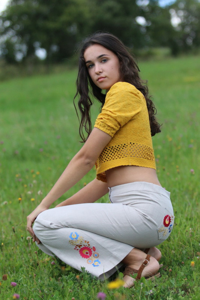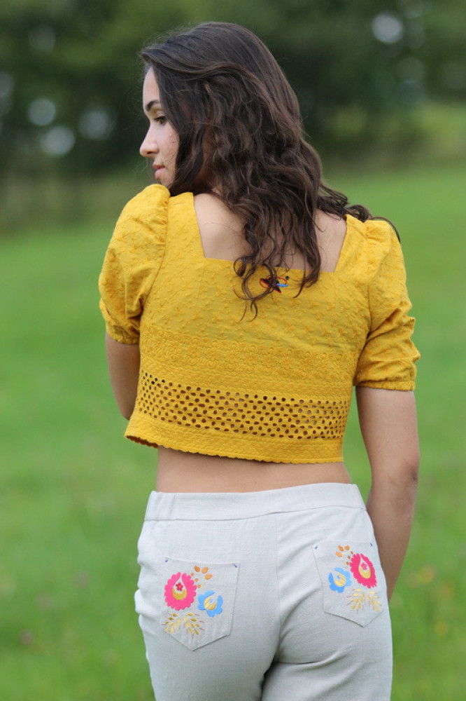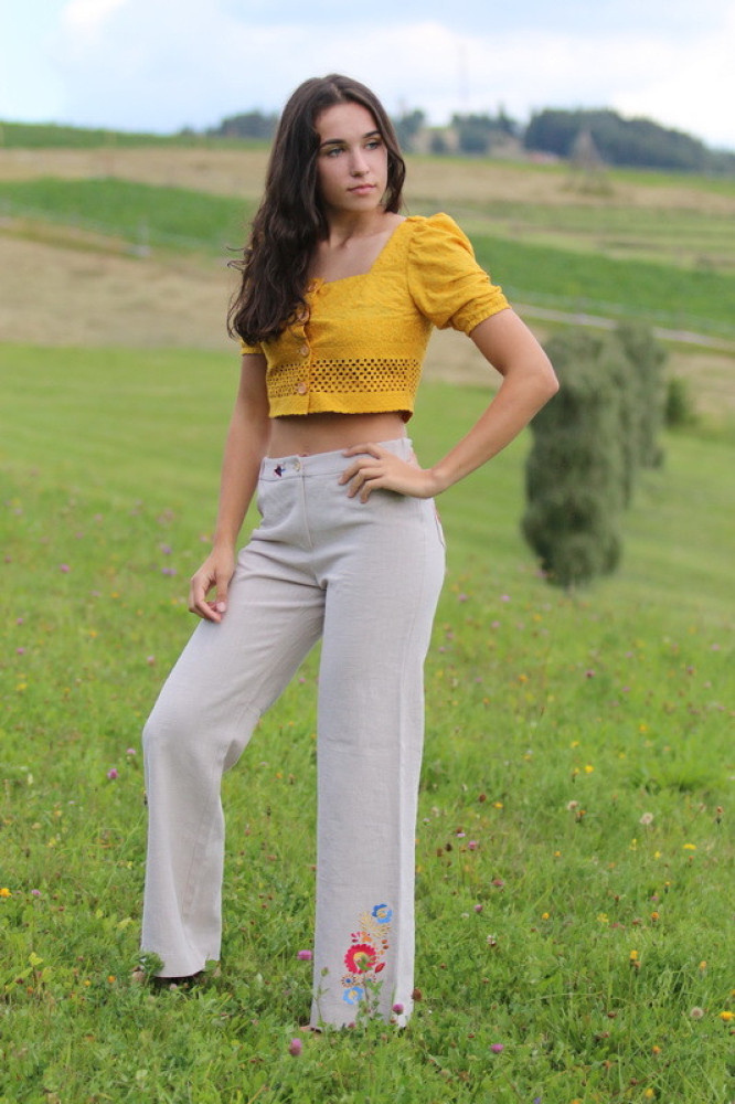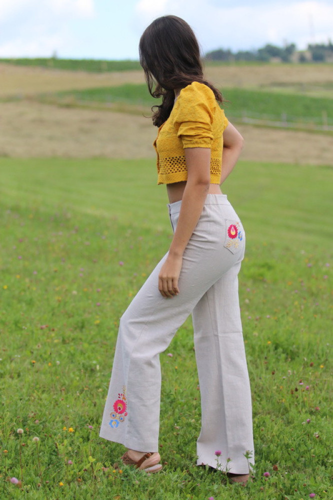 Vyšívané ľanové nohavice, vhodné na chladné aj teplé dni, umožňujú pokožke voľne dýchať. Vďaka svojmu pohodlnému strihu sú voľné, priedušné, pôsobia veľmi jemne a elegantne. Na zadnej strane majú rafinovane všité dve vrecká. Sú kombinovateľné s našimi crop topami, blúzkami, svetrami alebo s tričkom.