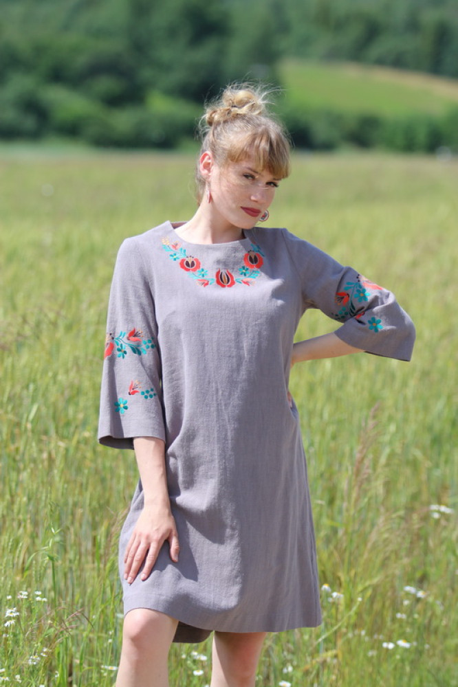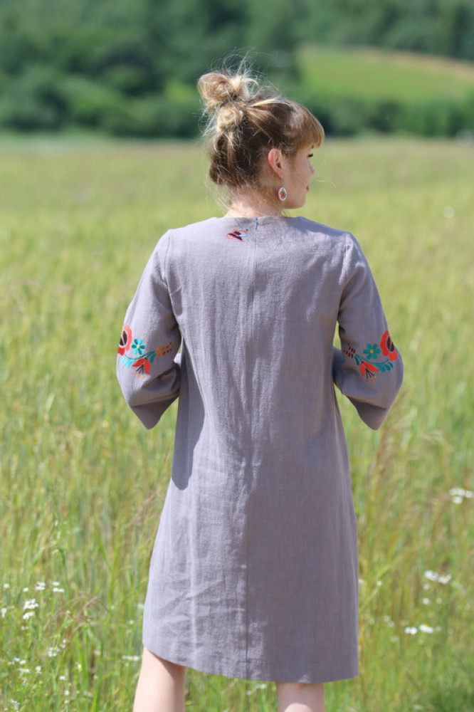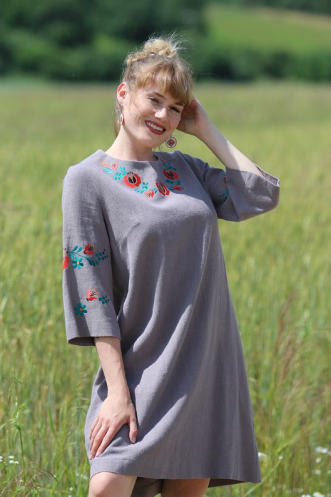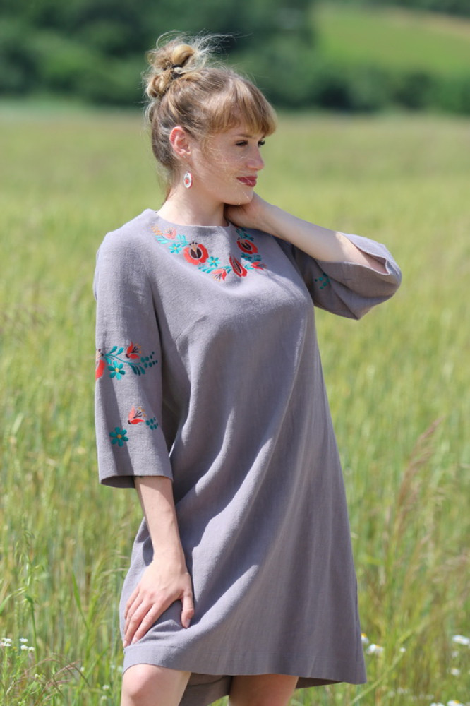 Krátke vyšívané ľanové šaty Šedá elegancia
