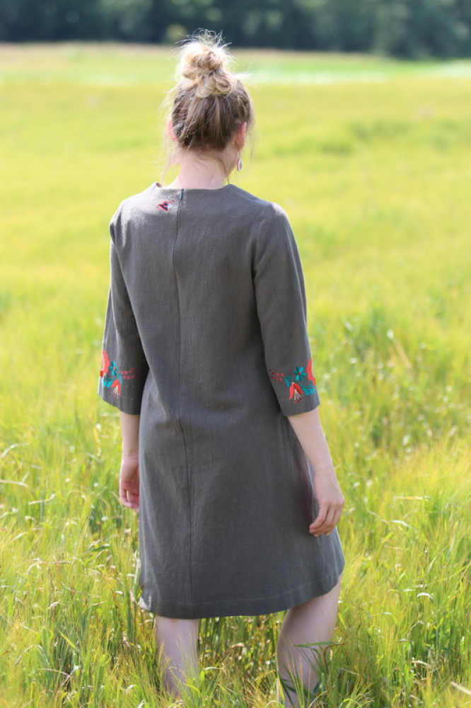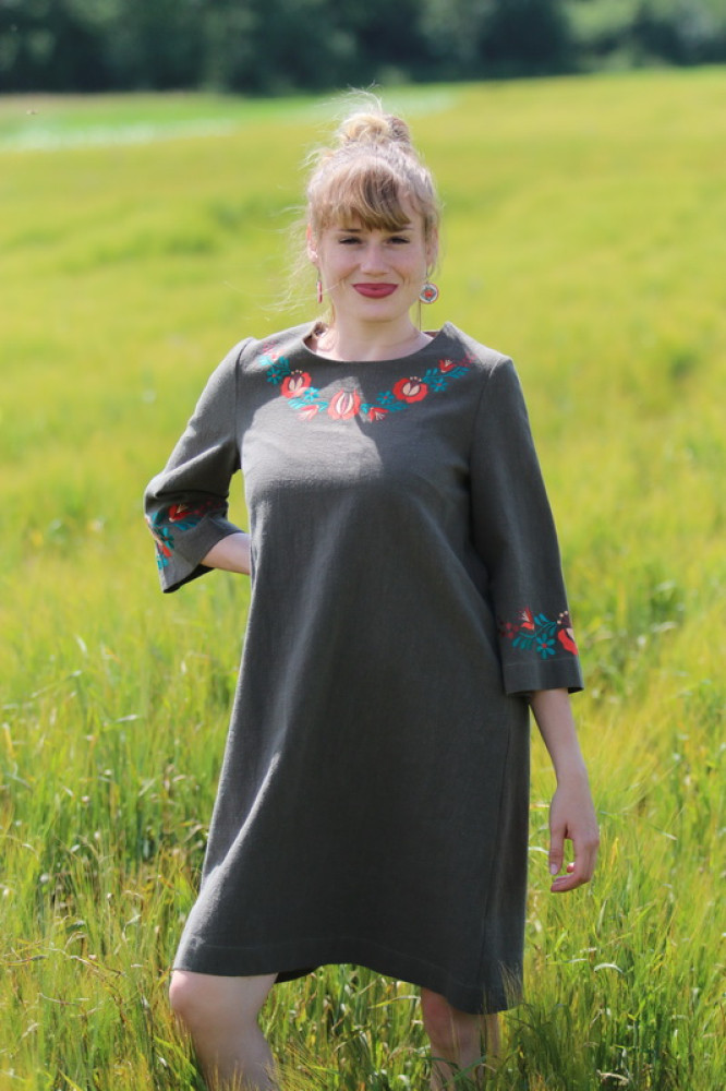 Krátke vyšívané ľanové šaty V zelenej tôni