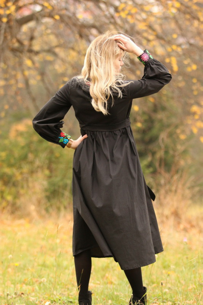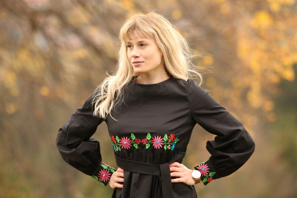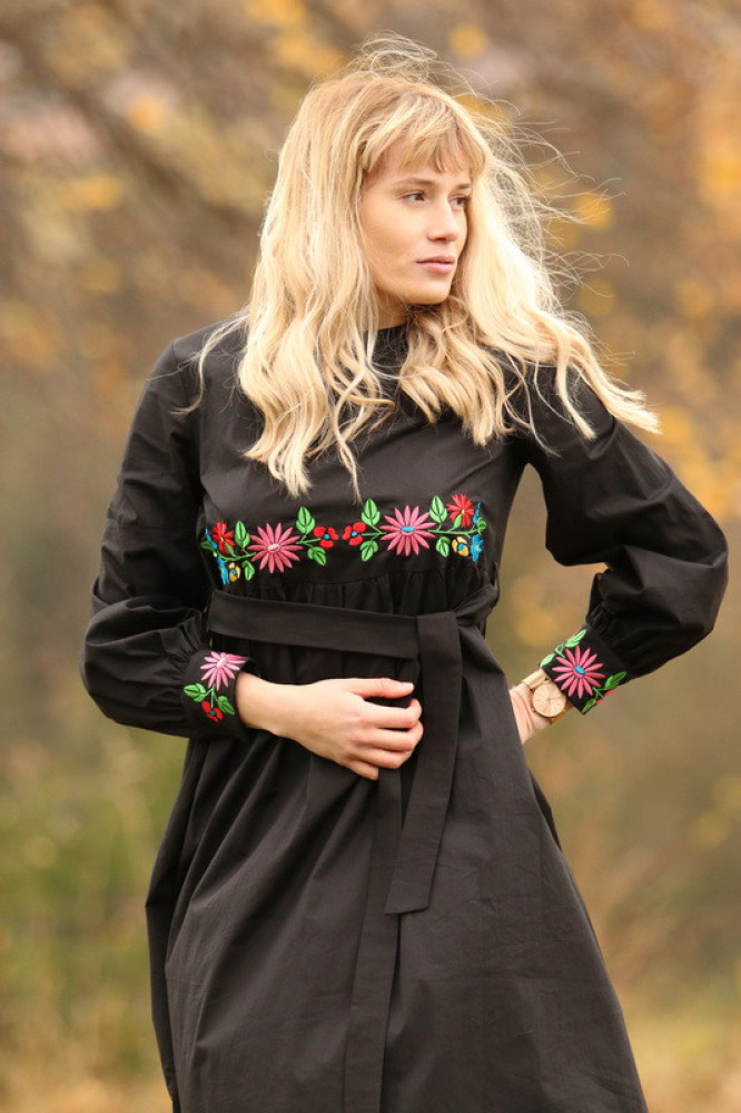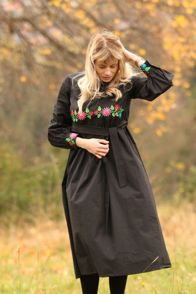 Elegantné čierne šaty Krojové.sk zdobené jemnou kvetinovou výšivkou prinášajú spojenie tradície a moderného pohodlia. Príjemný materiál s obsahom 97 % bavlny a 3 % elastanu je ľahký, priedušný a zároveň sa krásne prispôsobí postave. Zvýraznený pás a voľnejšia sukňa vytvárajú ženskú, nadčasovú siluetu vhodnú na bežné dni aj slávnostné chvíle.