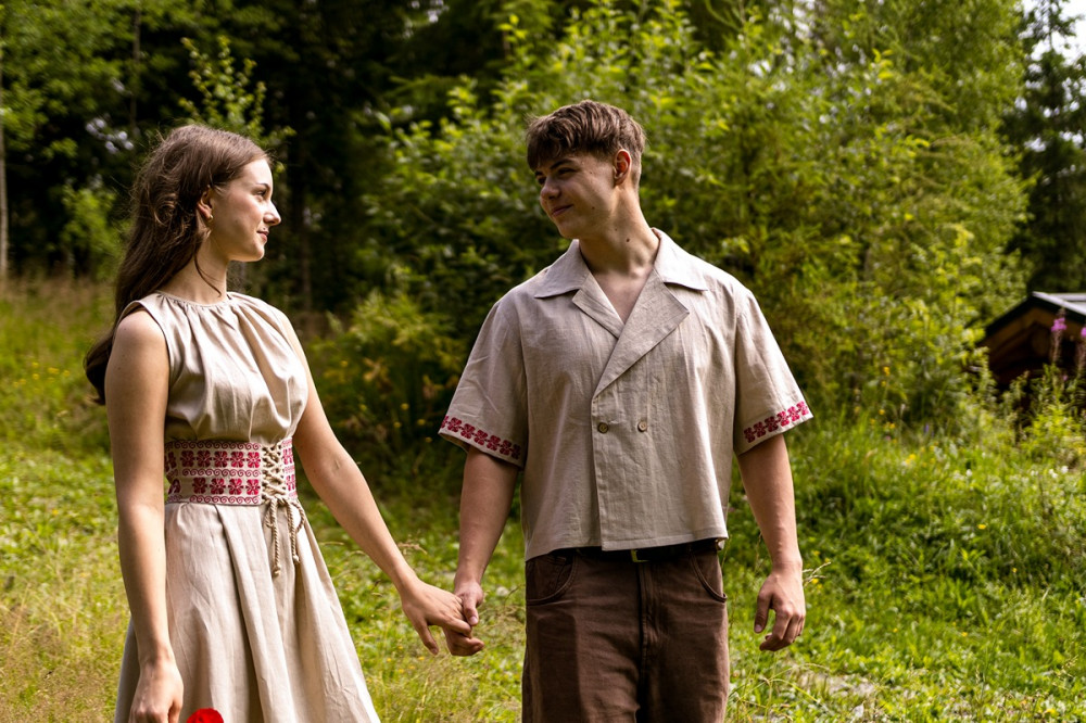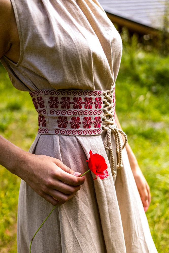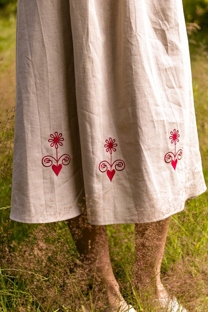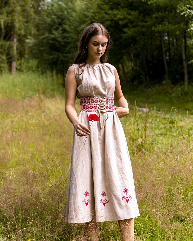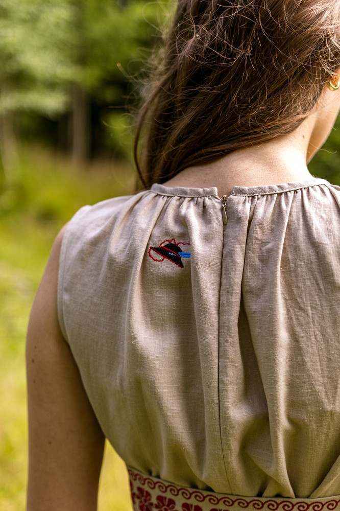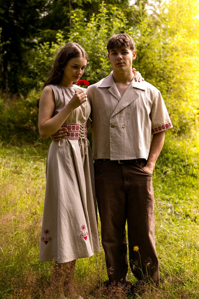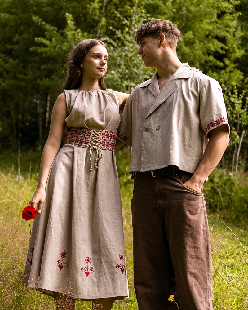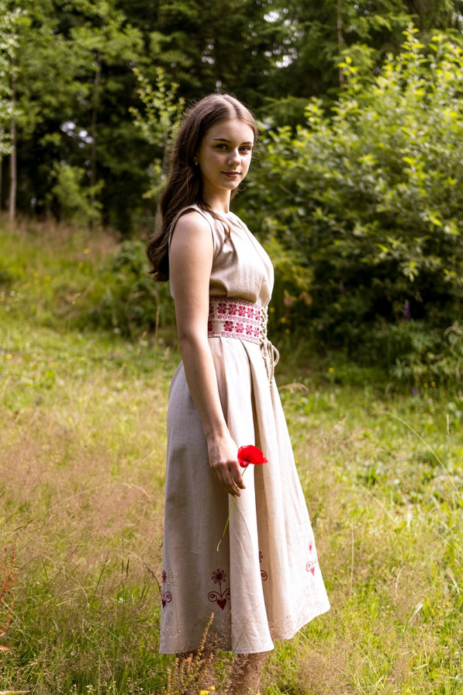 Šaty sú ušité z priedušného 100 % ľanu, vďaka čomu sú ideálne na letné dni aj slávnostné príležitosti. Nariasený výstrih dodáva jemný objem, zatiaľ čo opasok zvýrazňuje siluetu a dotvára celkový folklórny charakter modelu.