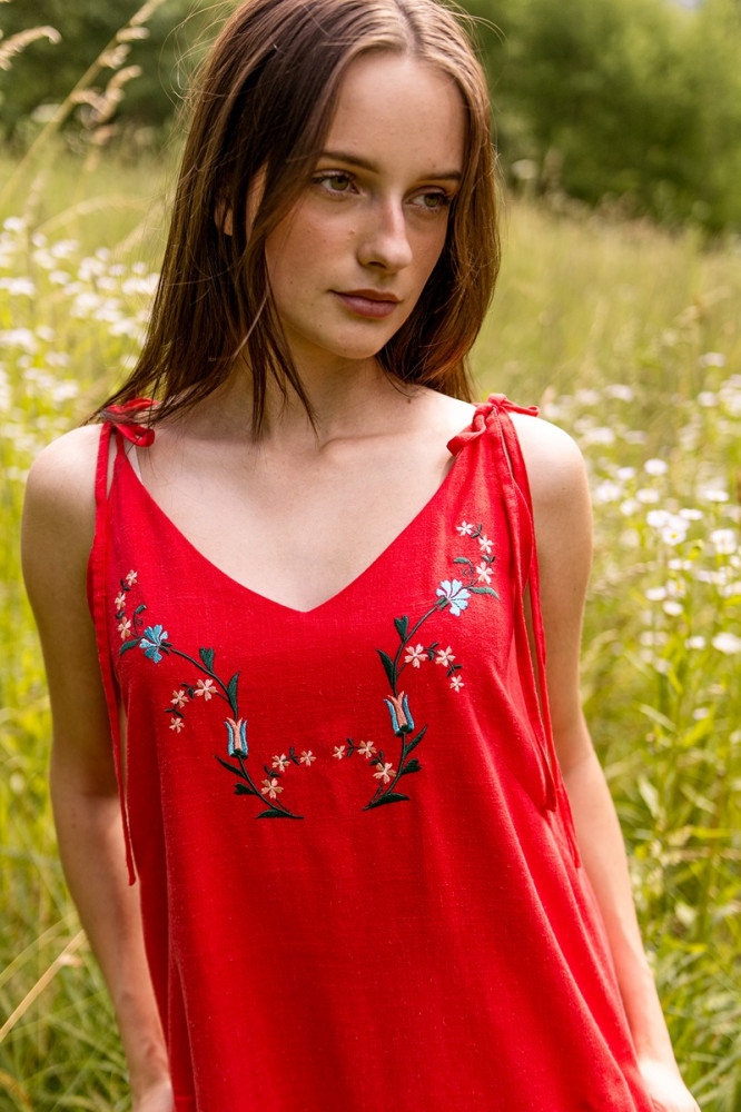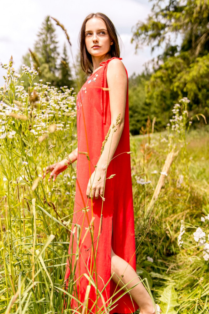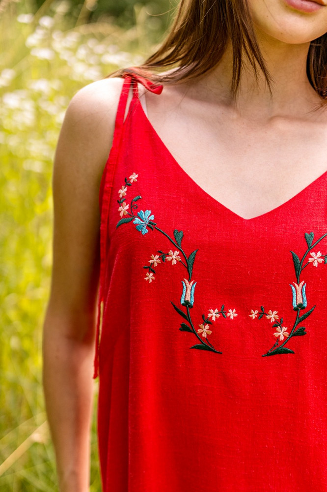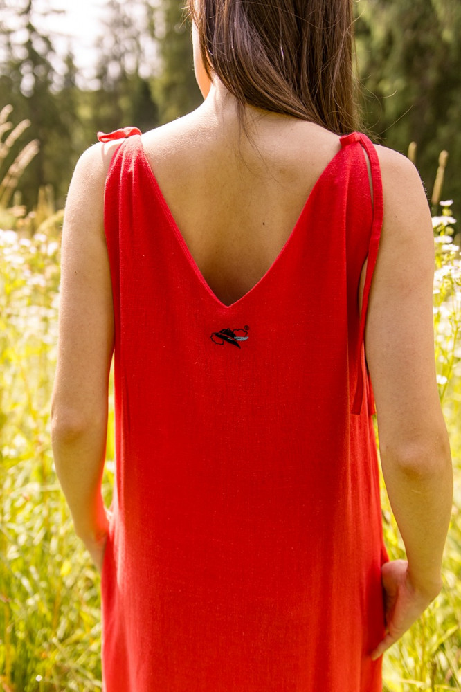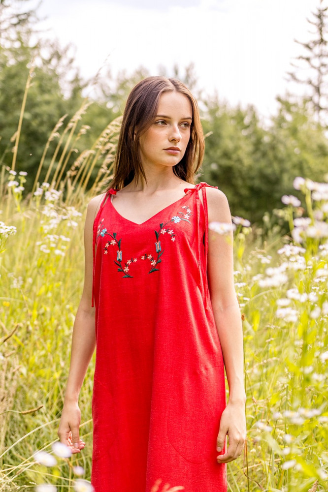 Strih so zaväzovaním na ramenách je pohodlný a lichotivý, priedušný ľan zaručuje komfort počas celého dňa. Výrazné, ale nositeľné – šaty Tulipán sú ideálnym spojením tradície a súčasného štýlu.