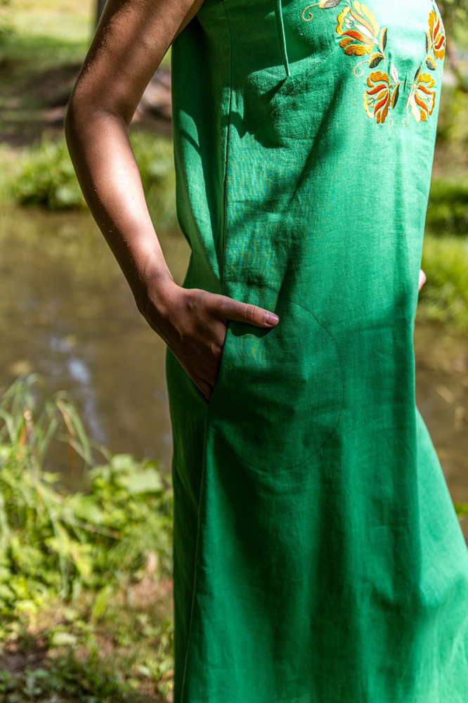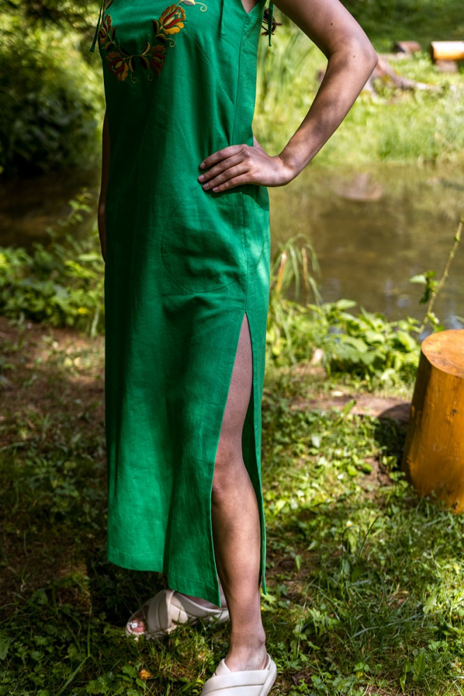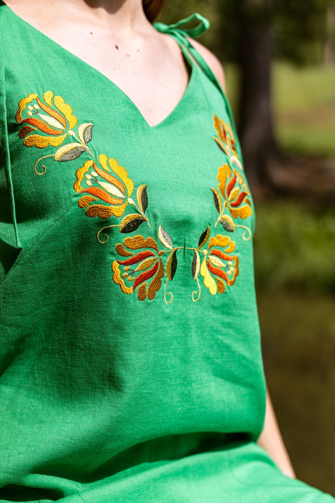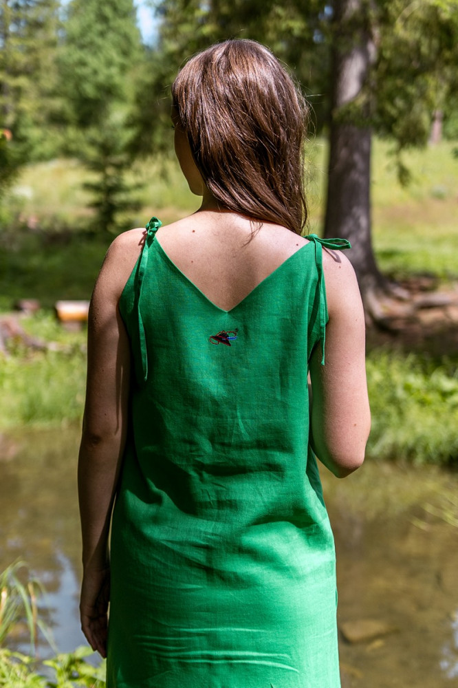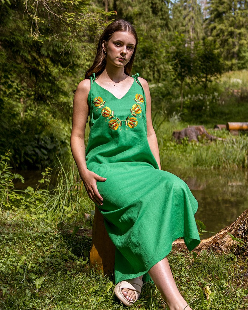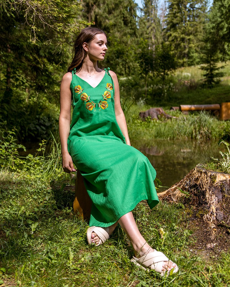 Letný model dlhých vyšívaných ľanových šiat s vreckami, bočným rázporkom a nastaviteľnými ramienkami pre maximálne pohodlie a komfort. Je ich možné zaviazať v akejkoľvek dĺžke.