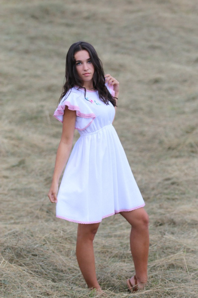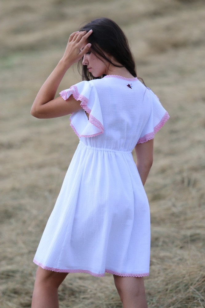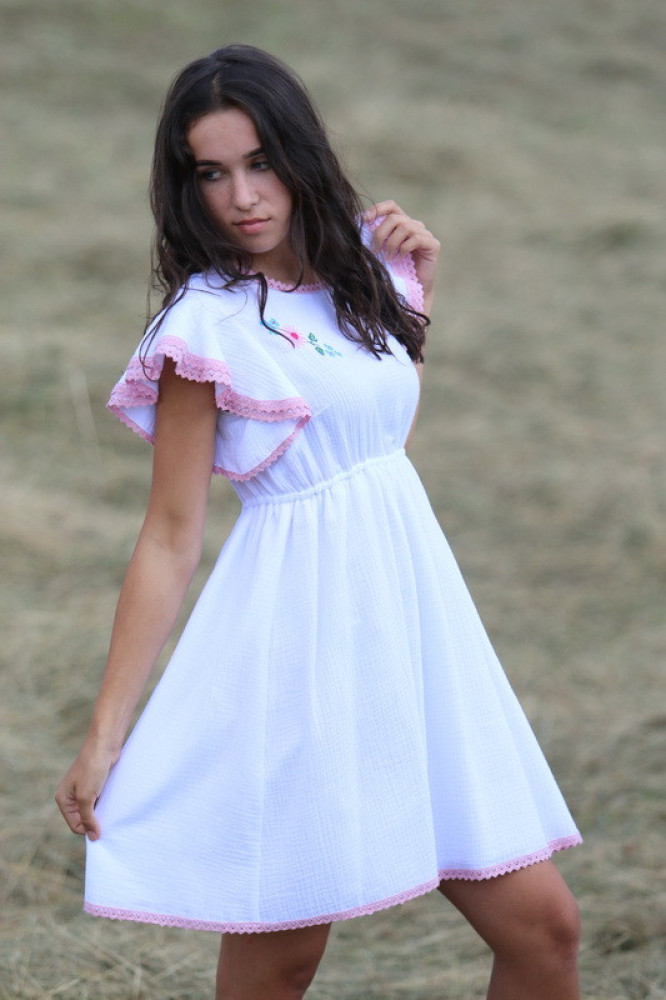 Jemné vyšívané šaty z mušelínu lemované s krásnou háčkovanou čipkou. Sú veľmi pohodlné, voľné a vzdušné. Vhodné na letné teplé dni, na kultúrne podujatie, či romantickú prechádzku.