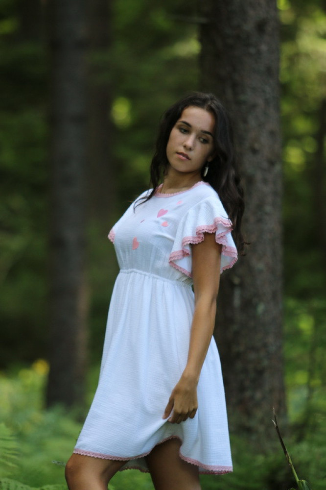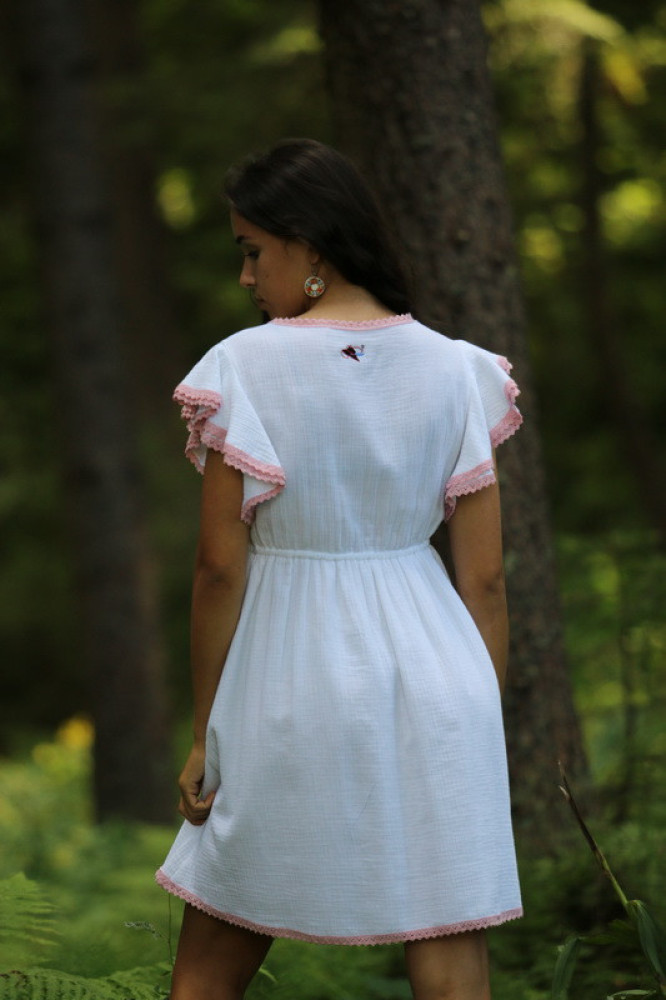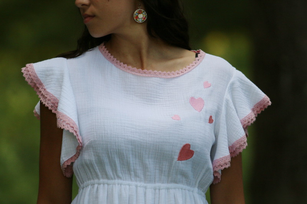 Jemné vyšívané šaty z mušelínu lemované s krásnou háčkovanou čipkou. Sú veľmi pohodlné, voľné a vzdušné. Vhodné na letné teplé dni, na kultúrne podujatie, či romantickú prechádzku.