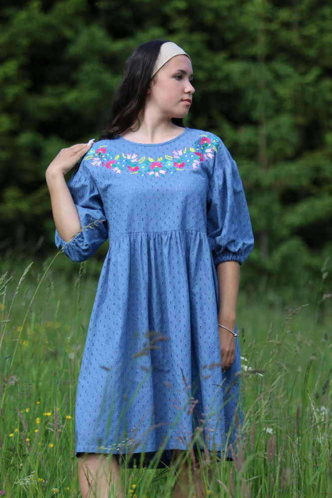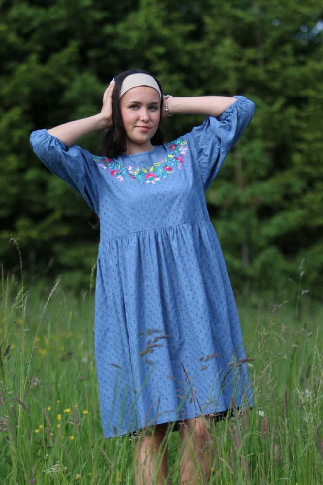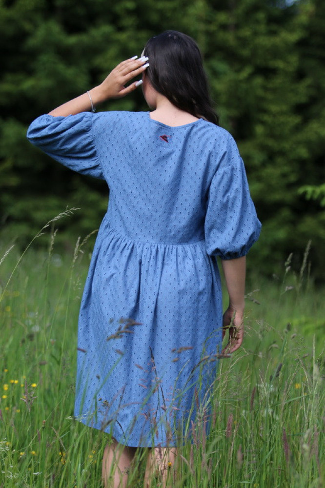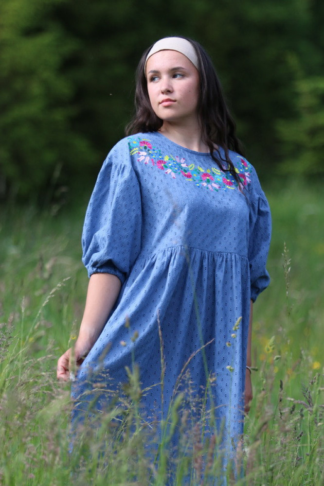 Vyšívané madeirové šaty oversize strihu s nariasenými puff rukávmi. Sú vhodné na celoročné nosenie na spoločenské akcie, kultúrne podujatia alebo len tak do mesta. Pôsobia romanticky, sú veľmi ľahké, pohodlné a elegantné.
