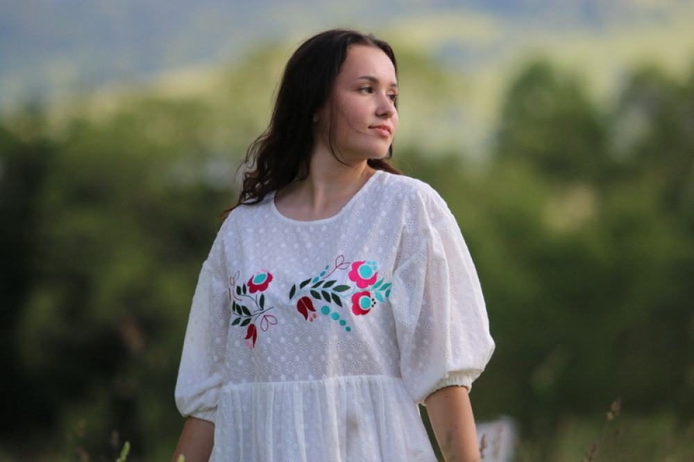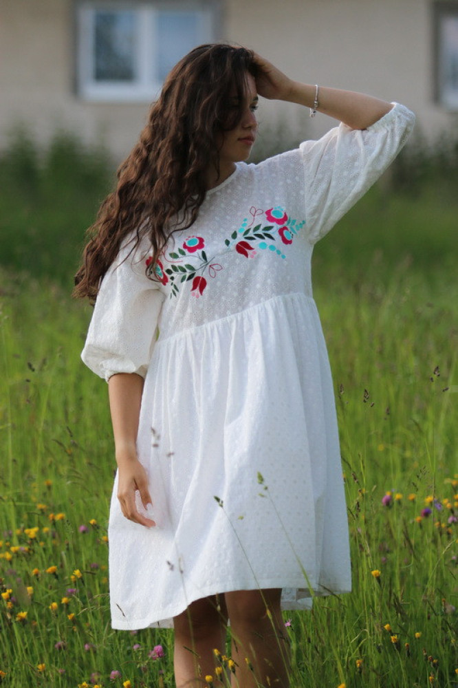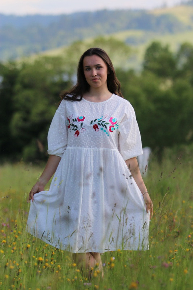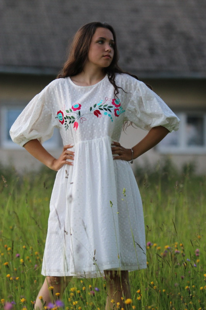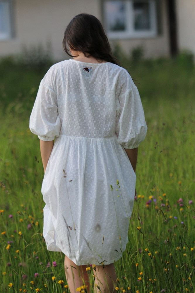 Vyšívané madeirové šaty oversize strihu s nariasenými puff rukávmi. Sú vhodné na celoročné nosenie na spoločenské akcie, kultúrne podujatia alebo len tak do mesta. Pôsobia romanticky, sú veľmi ľahké, pohodlné a elegantné.