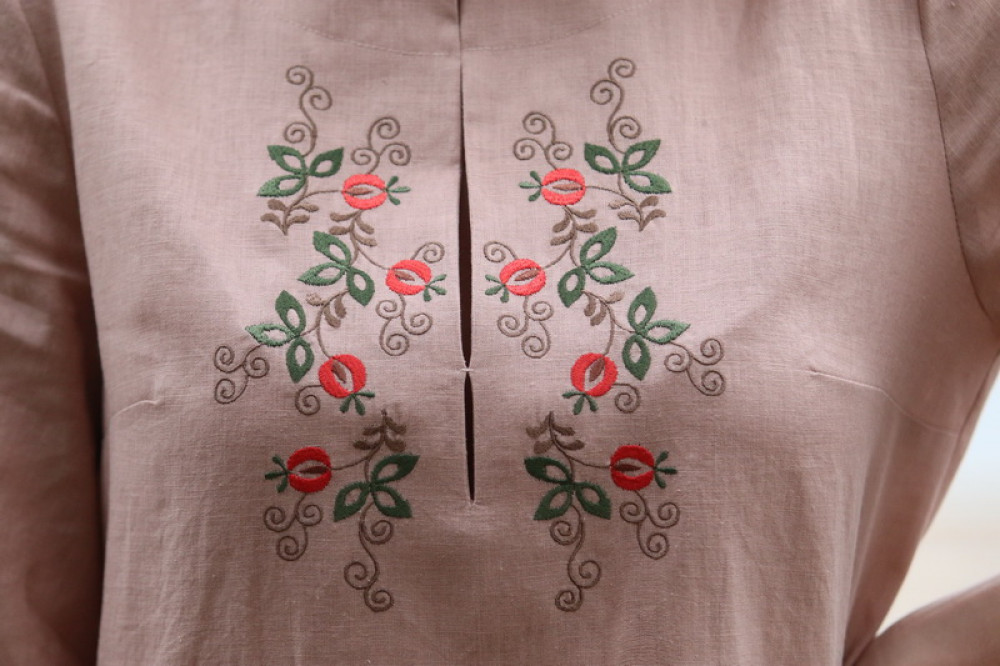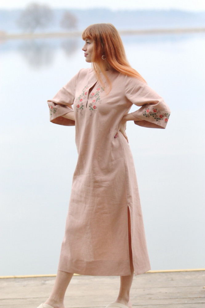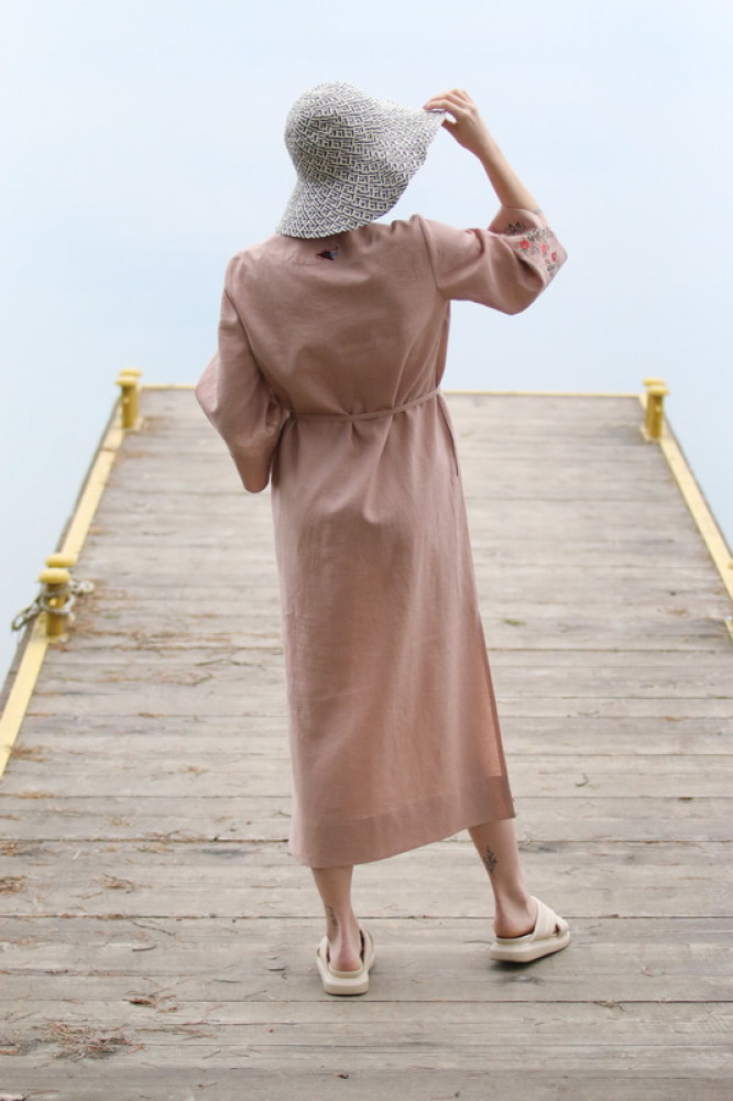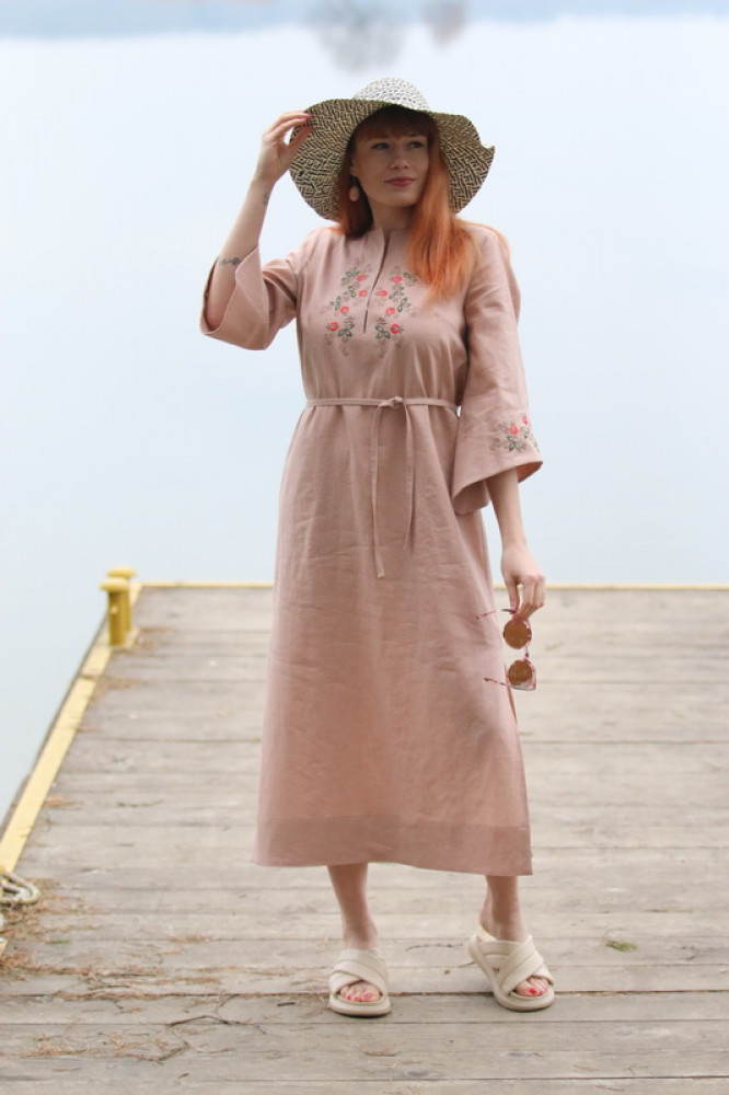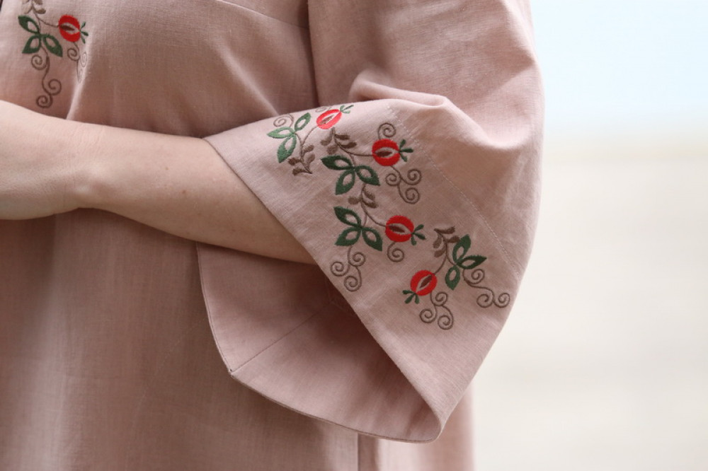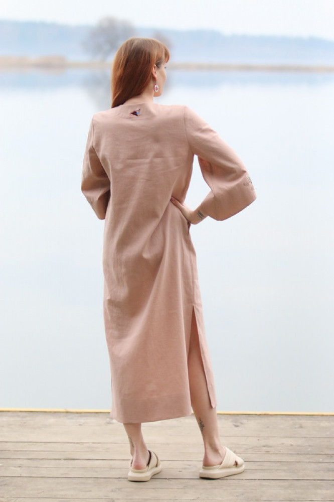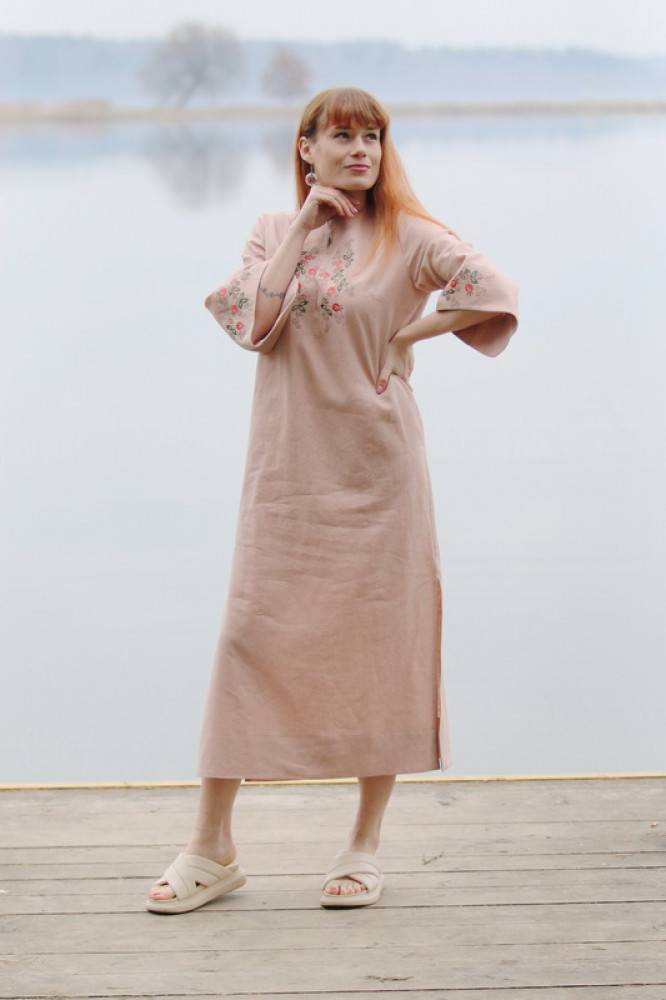 Letný model dlhých vyšívaných ľanových šiat s vreckami, trendy kimono rukávmi a oversize strihom pre maximálne pohodlie a komfort. Šaty je možné v páse zviazať opaskom.