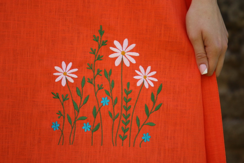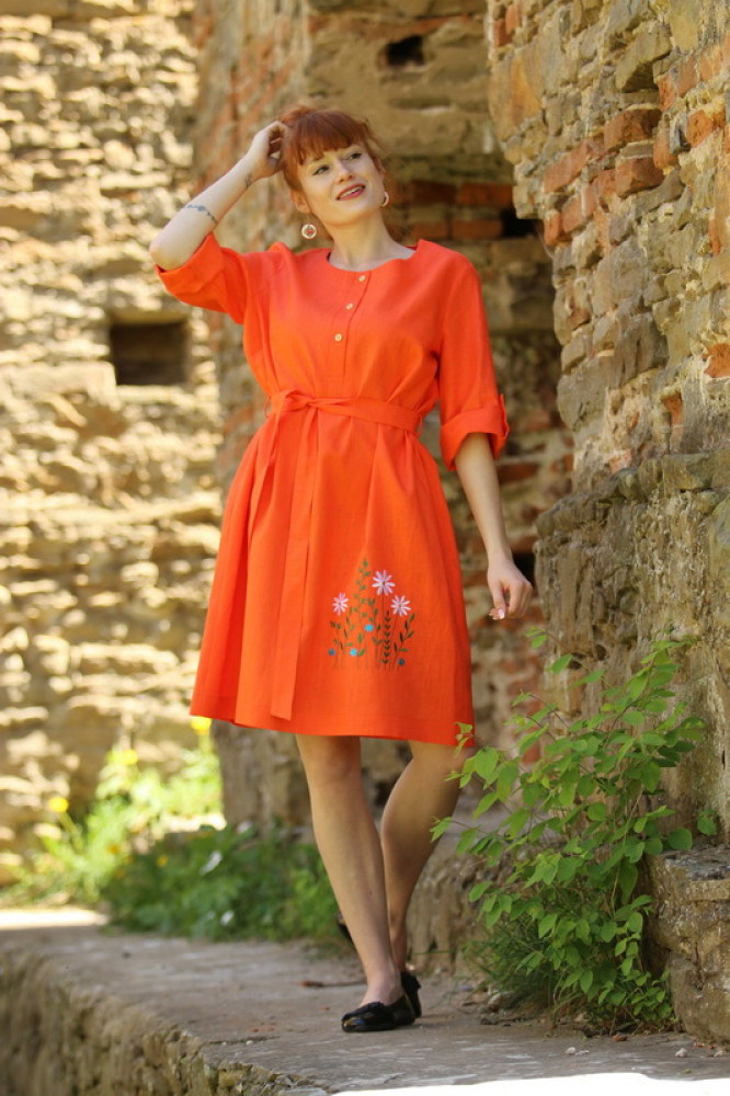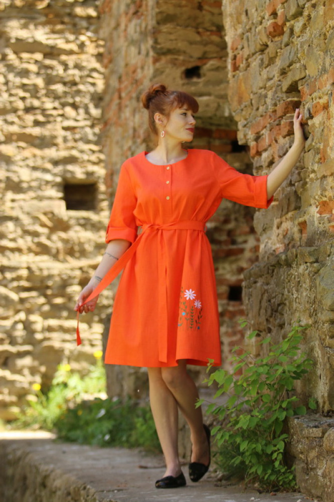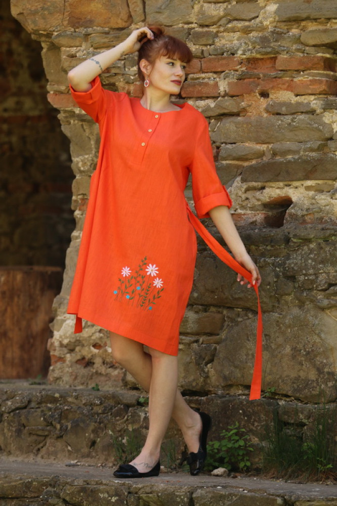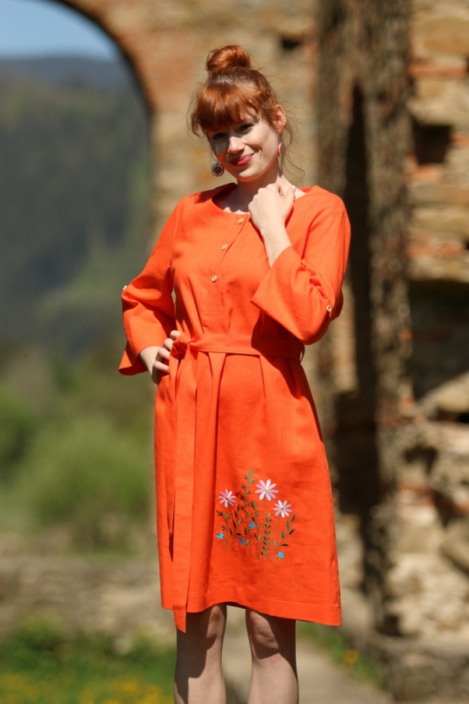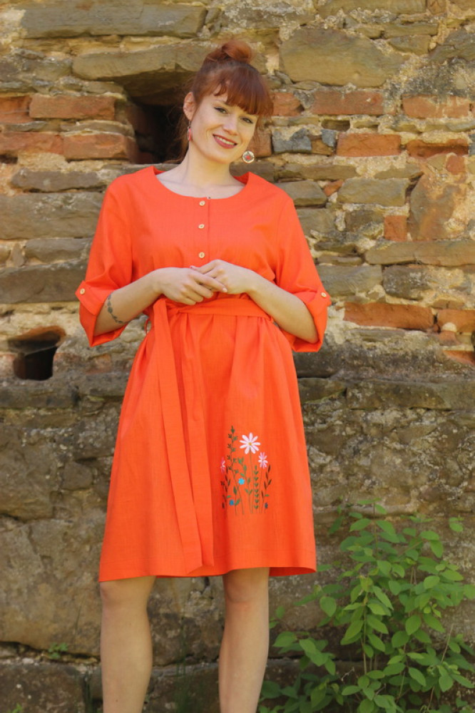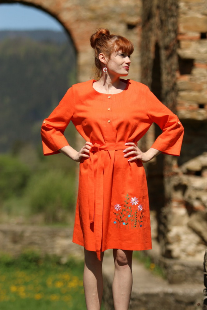 Vyšívané ľanové šaty s krátkym rozšíreným rukávom, prepracovaného a pohodlného voľného strihu do áčka, ktorý jemne kopíruje postavu. Pôsobia výrazne žensky. Sú vhodné nielen na spoločenské udalosti ale aj k celoročnému noseniu. V páse nádherne zvýrazní driek opasok, ktorým si regulujete viazanie.