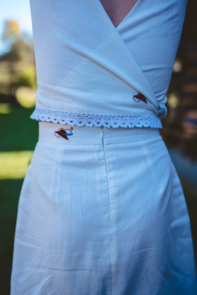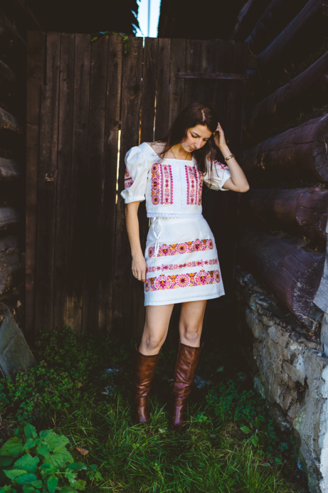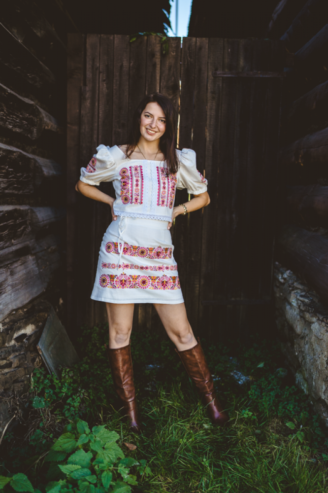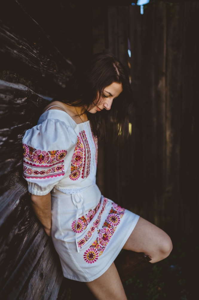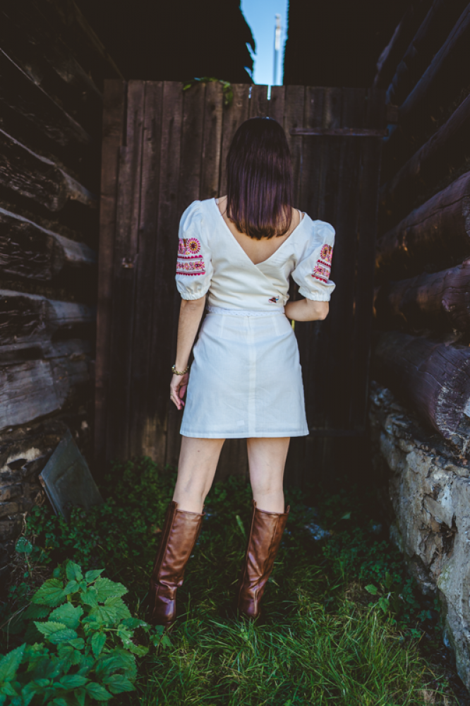 Krátka ľanová vyšívaná sukňa jemného áčkového strihu. Na prednom diele je zdobená autorskou výšivkou inšpirovanou tradičnou slovenskou ľudovou kultúrou. Suknička je kombinovateľná s vyšívaným ľanovým crop topom.