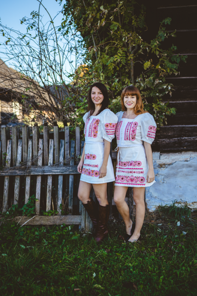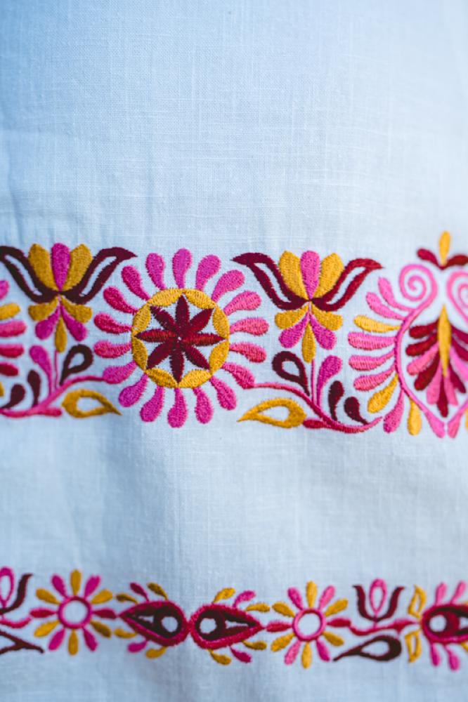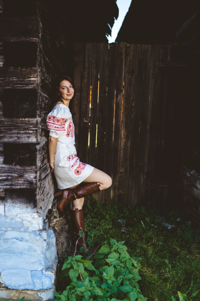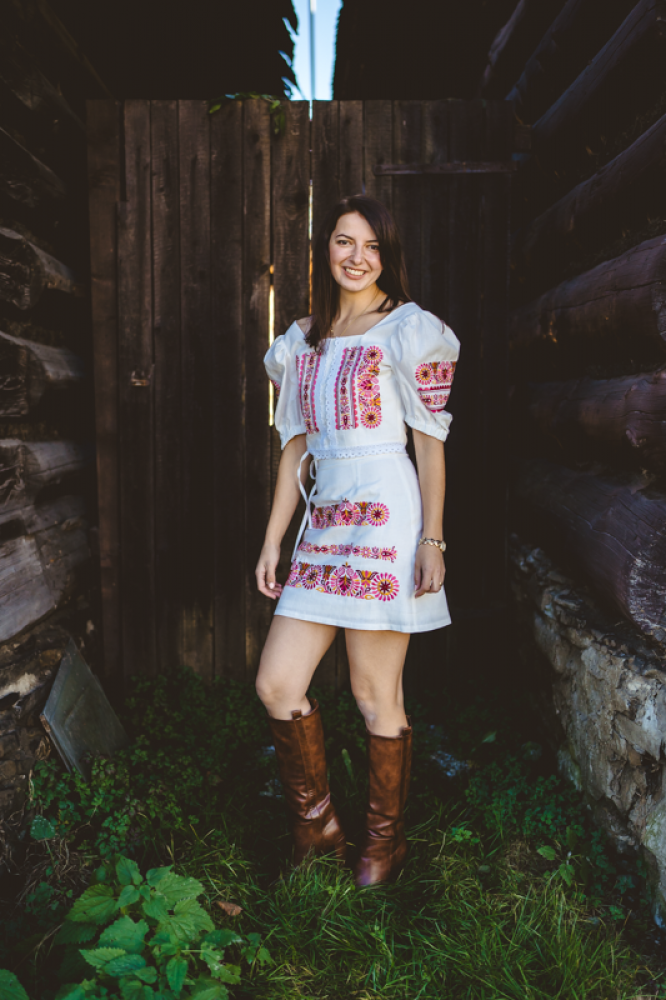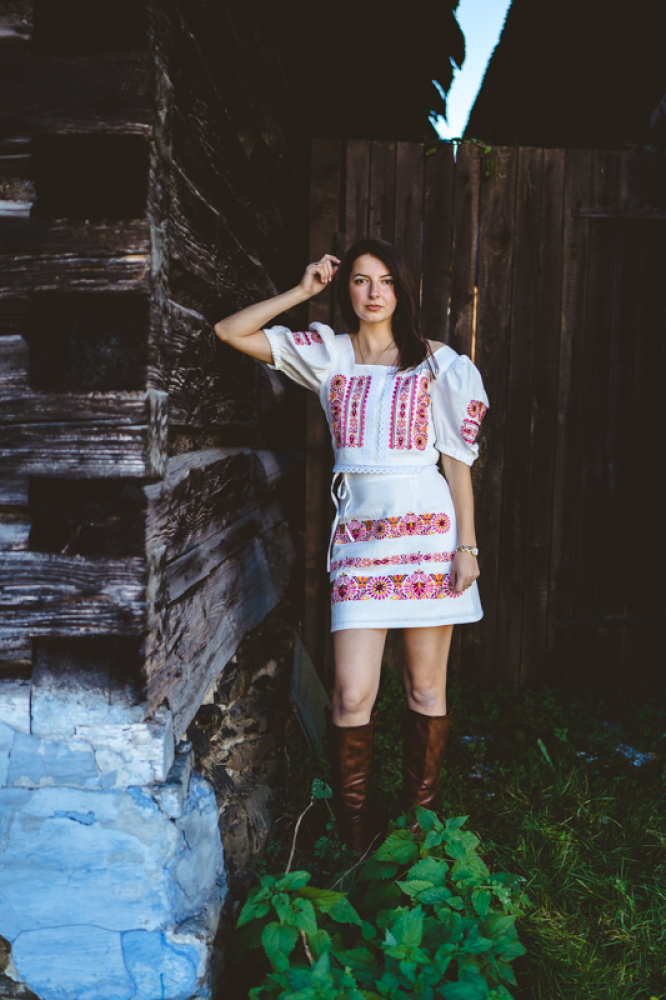 Krátka ľanová vyšívaná sukňa jemného áčkového strihu. Na prednom diele je zdobená autorskou výšivkou inšpirovanou tradičnou slovenskou ľudovou kultúrou. Suknička je kombinovateľná s vyšívaným ľanovým crop topom.