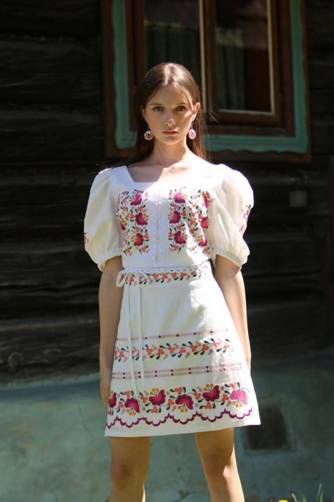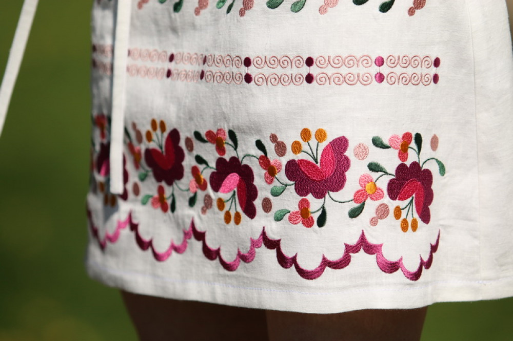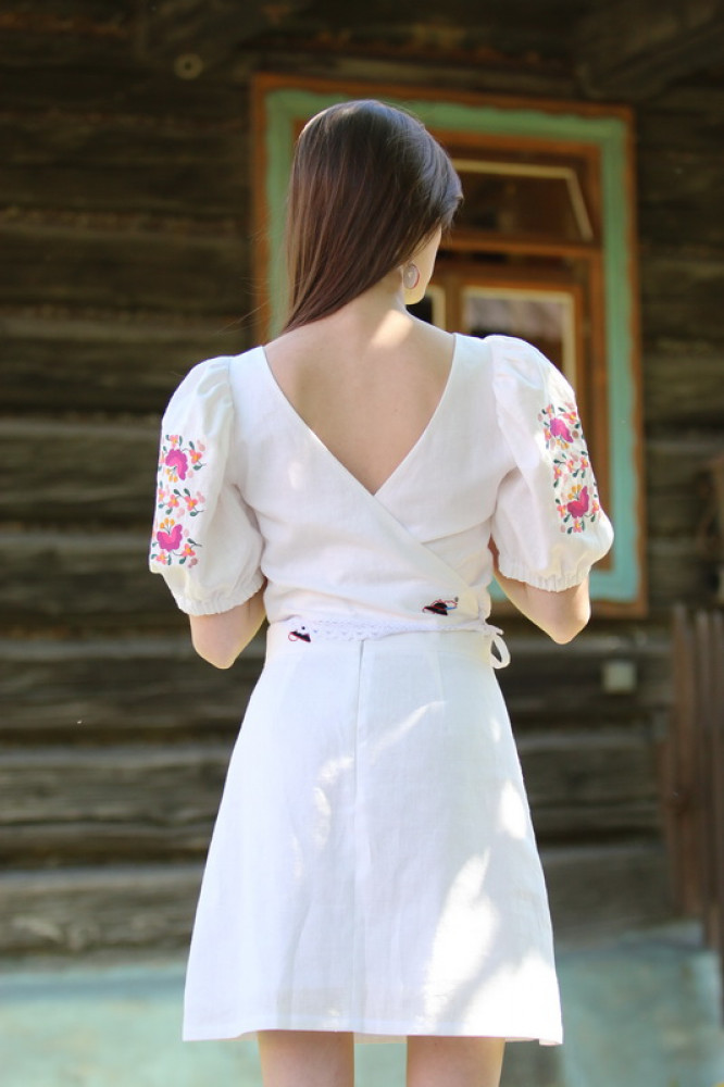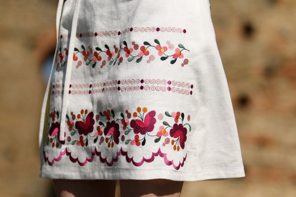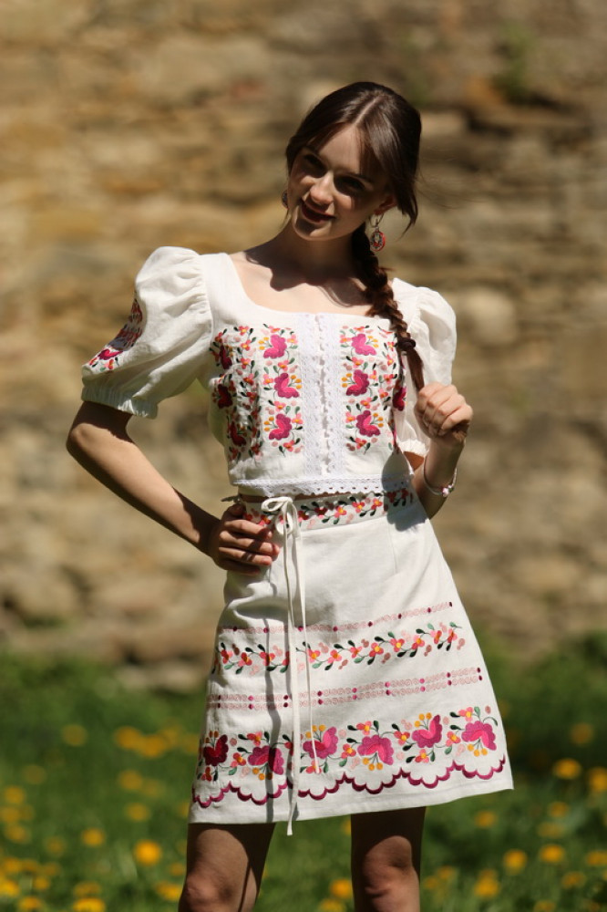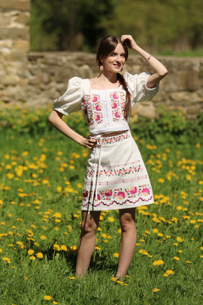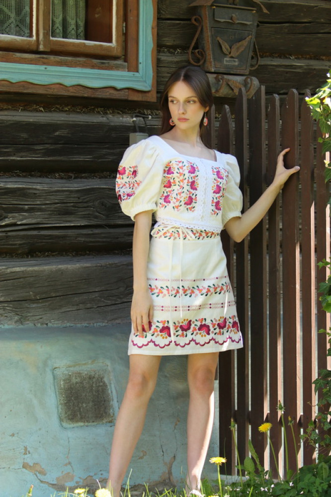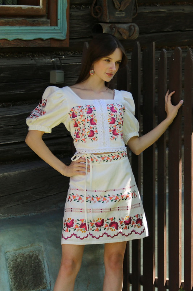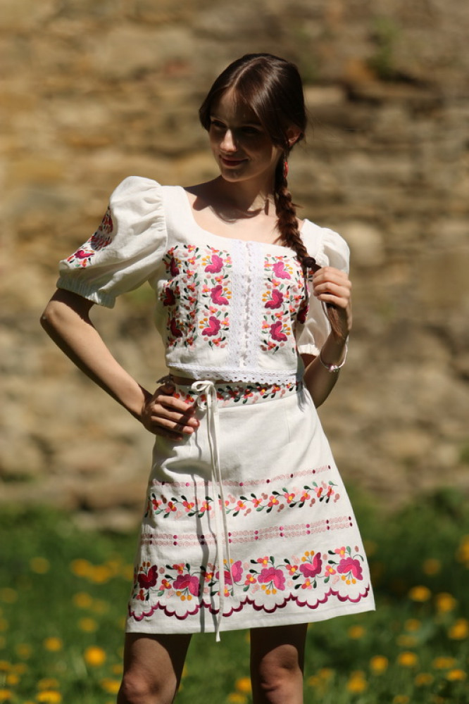 Krátka ľanová vyšívaná sukňa jemného áčkového strihu. Na prednom diele je zdobená autorskou výšivkou inšpirovanou tradičnou slovenskou ľudovou kultúrou. Suknička je kombinovateľná s vyšívaným ľanovým crop topom.