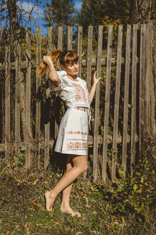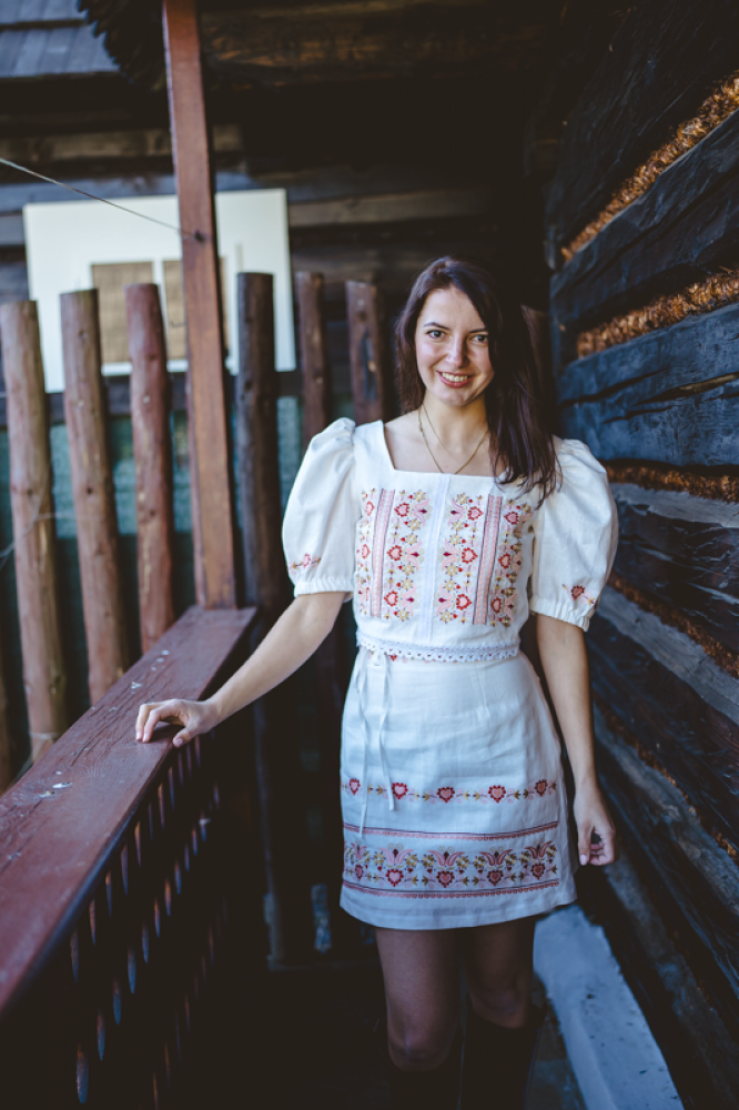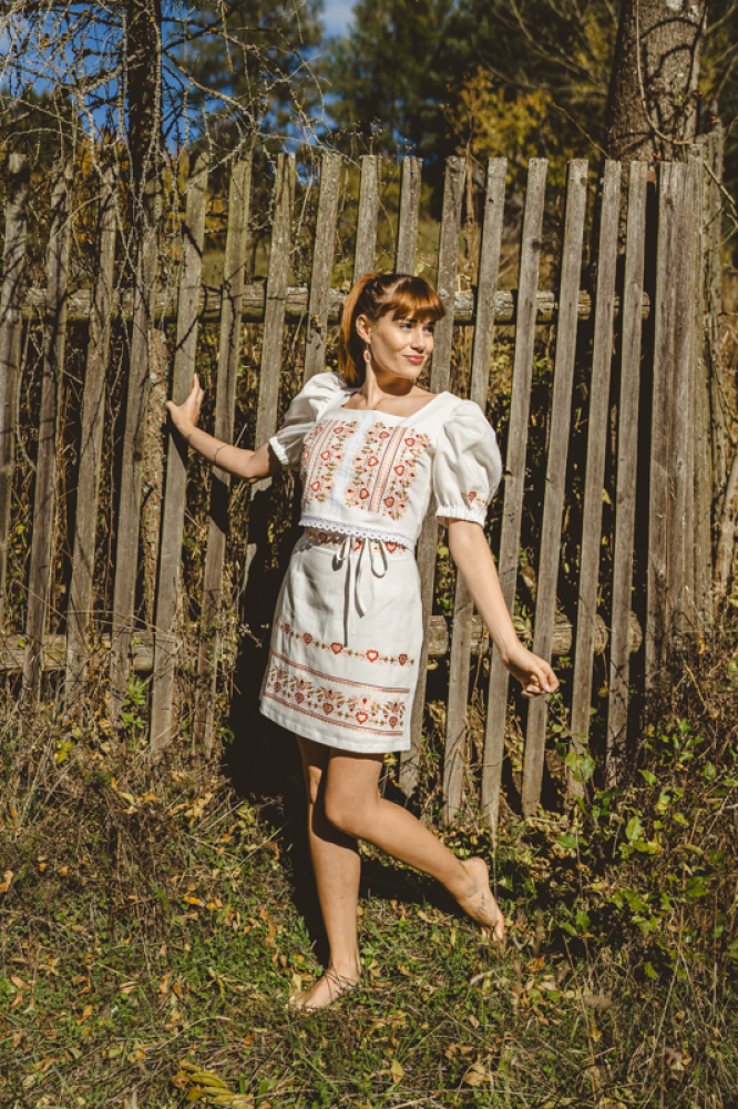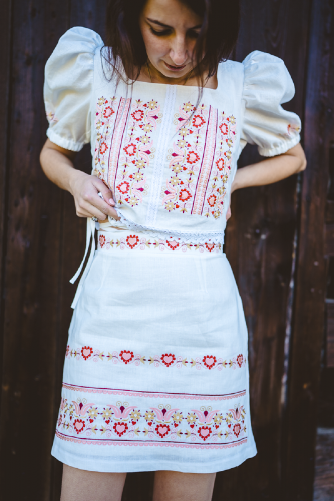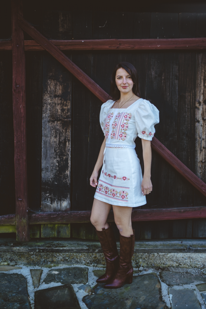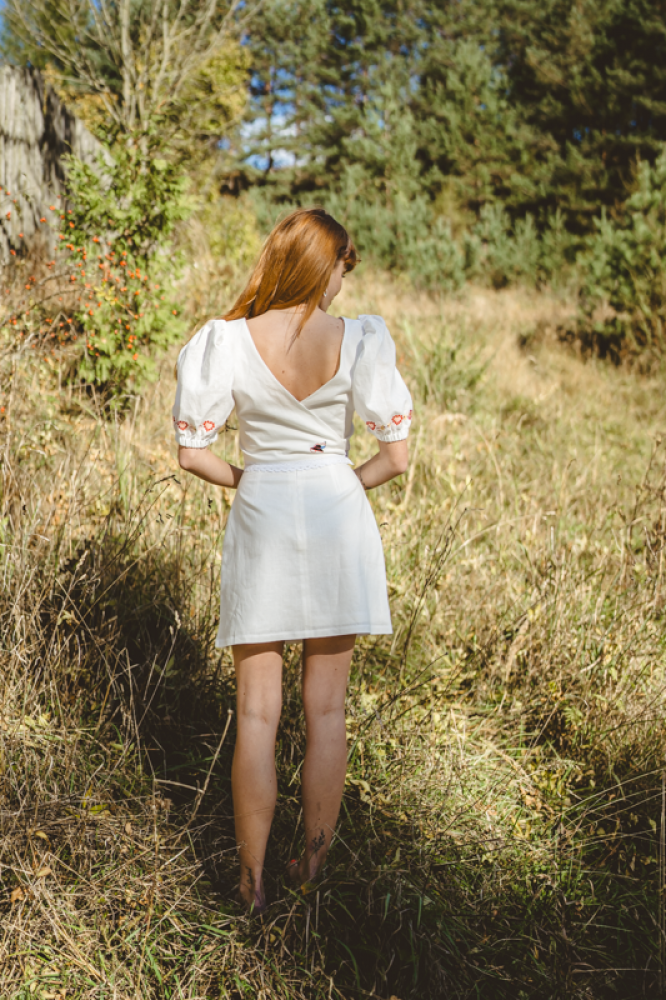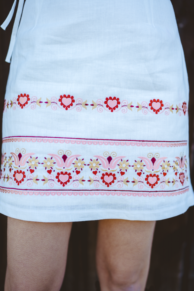 Krátka ľanová vyšívaná sukňa jemného áčkového strihu. Na prednom diele je zdobená autorskou výšivkou inšpirovanou tradičnou slovenskou ľudovou kultúrou. Suknička je kombinovateľná s vyšívaným ľanovým crop topom.