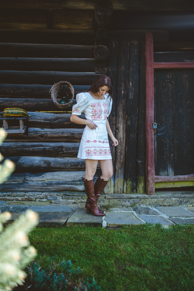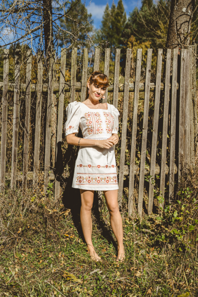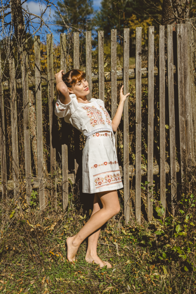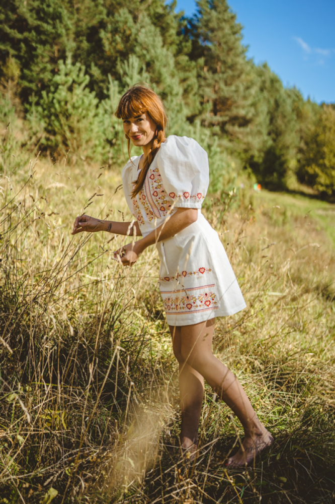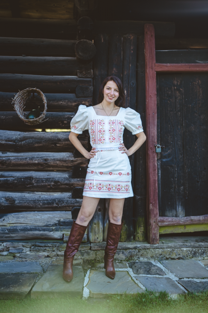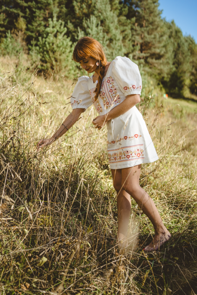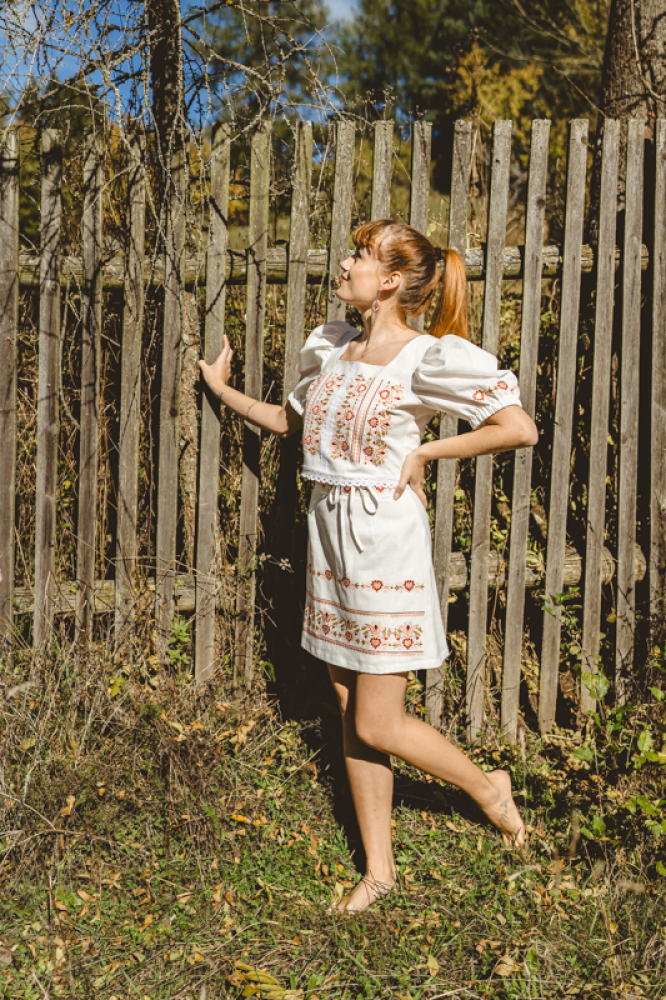 Krátka ľanová vyšívaná sukňa jemného áčkového strihu. Na prednom diele je zdobená autorskou výšivkou inšpirovanou tradičnou slovenskou ľudovou kultúrou. Suknička je kombinovateľná s vyšívaným ľanovým crop topom.