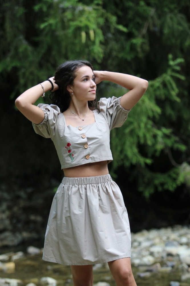 Vyšívaný bavlnený crop top Krojové.sk so zapínaním na drevené gombičky s balónikovými rukávmi. Pôsobí elegantne a sviežo, je vhodný na rôzne spoločenské akcie alebo na bežné nosenie k nohaviciam či k sukni. Kvalitne vypracovaný kúsok je veľmi príjemný, pri nosení pohodlný, vzdušný a na dotyk jemný.