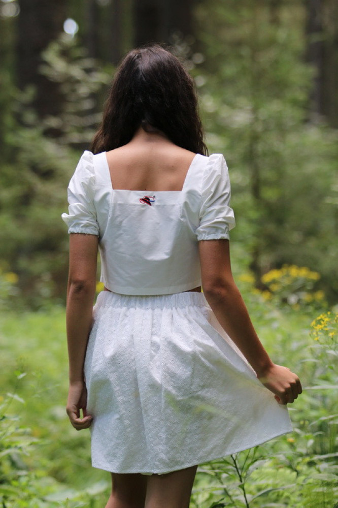 Vyšívaný bavlnený crop top so zapínaním na drevené gombičky s balónikovými rukávmi. Pôsobí elegantne a sviežo, je vhodný na rôzne spoločenské akcie alebo na bežné nosenie k nohaviciam či k sukni. Kvalitne vypracovaný kúsok je veľmi príjemný, pri nosení pohodlný, vzdušný a na dotyk jemný.