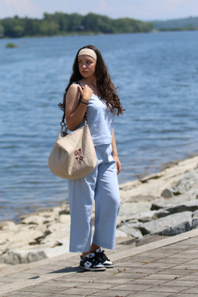 Dámske trendy ľanové tielko na tenké uväzovacie ramienka s V-výstrihom. Veľmi pohodlné, vzdušné, poskytuje komfort počas horúcich letných dní. Je možné ho kombinovať s kraťasmi, nohavicami či doplniť ho elegantným ľanovým sačkom z našej dielne.