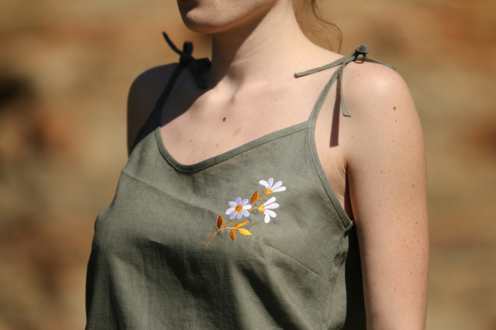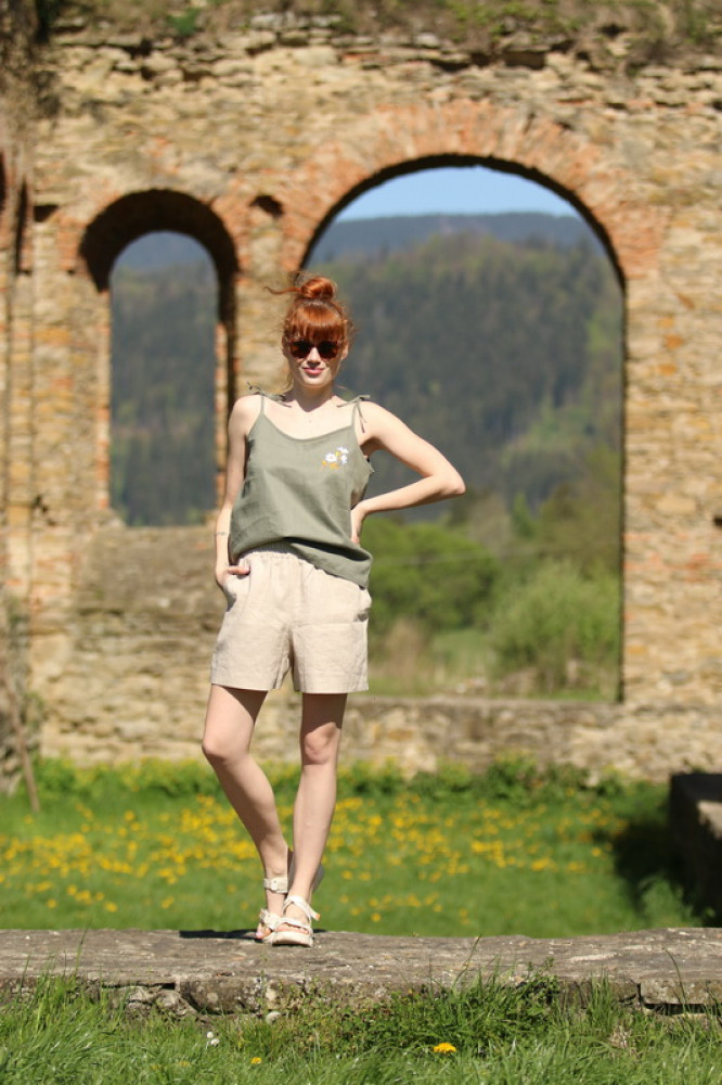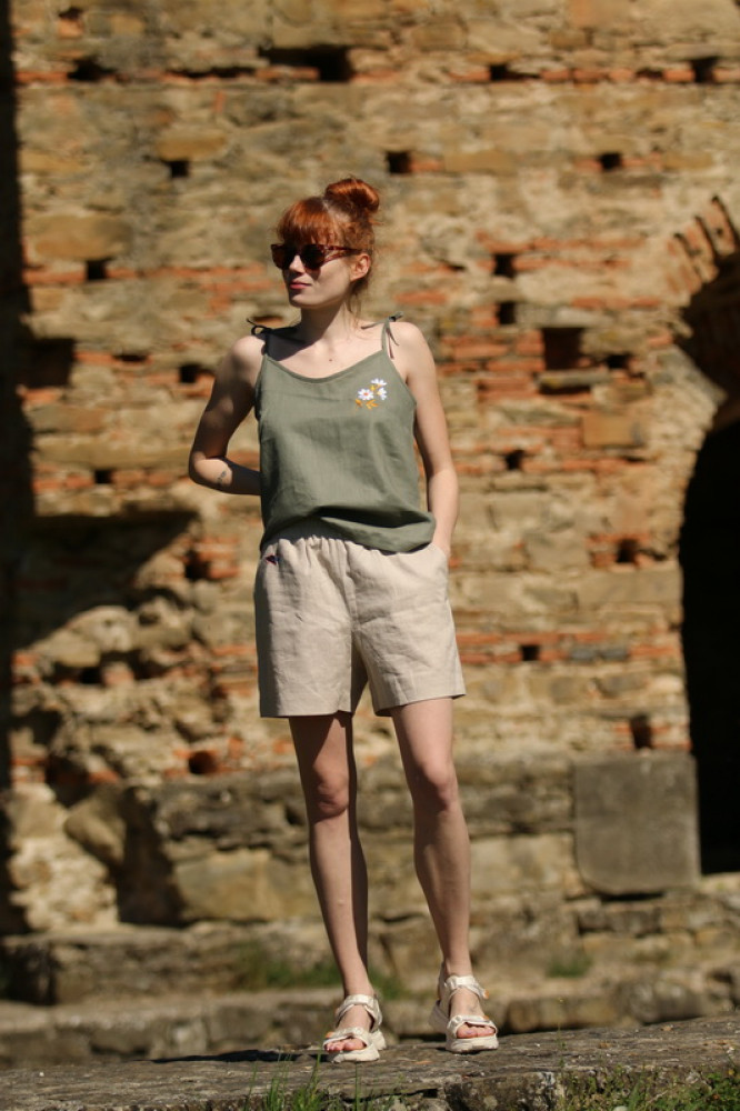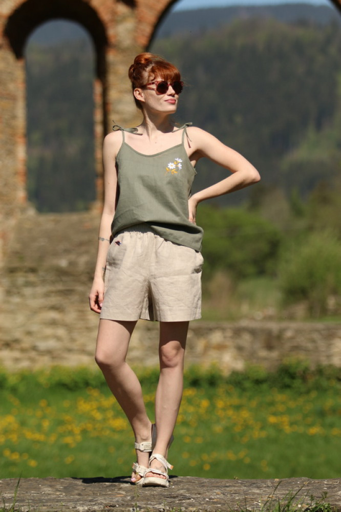Dámske vyšívané trendy ľanové tielko na tenké uväzovacie ramienka s V-výstrihom. Veľmi pohodlné, vzdušné, poskytuje komfort počas horúcich letných dní. Je možné ho kombinovať s kraťasmi, nohavicami či doplniť ho elegantným ľanovým sačkom z našej dielne.