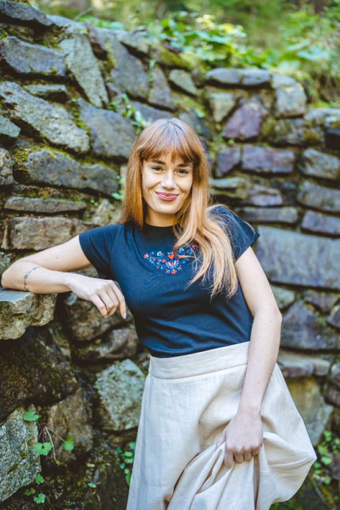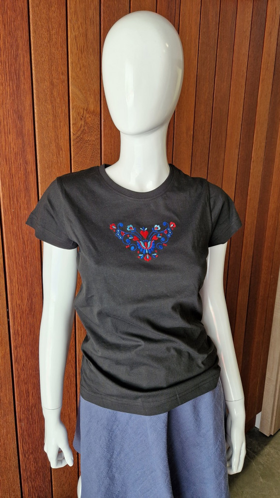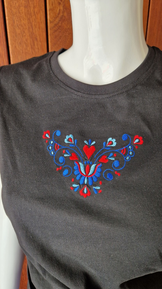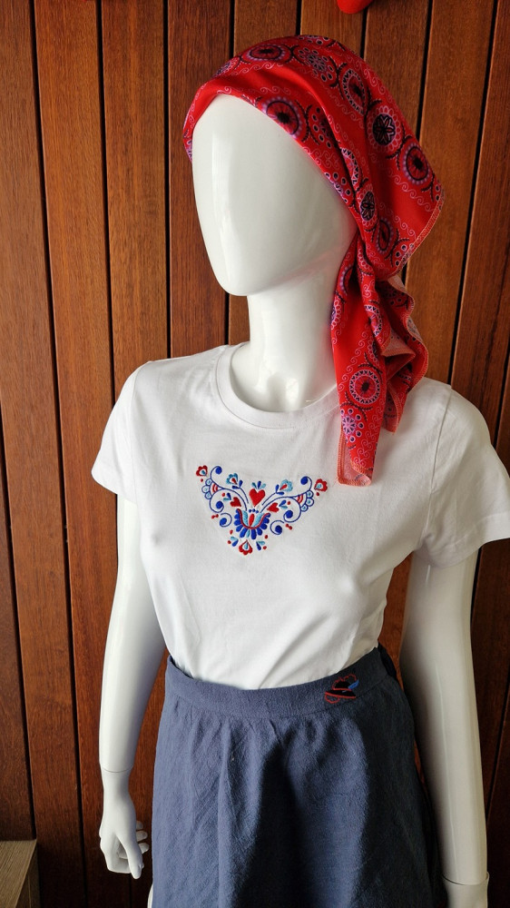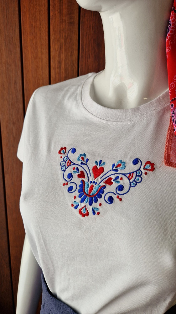 Dámske tričko s krátkym rukávom a jedinečnou výšivkou, v ktorom určite zažiarite. Je vyrobené zo 100% bavlny a pekne zvýrazní postavu. Využijete ho nielen počas horúcich letných dní ale i v chladnejšom počasí napríklad v kombinácii s elegantným sačkom z našej dielne. Je vhodné ako originálny darček, ktorý poteší nejednu ženu.