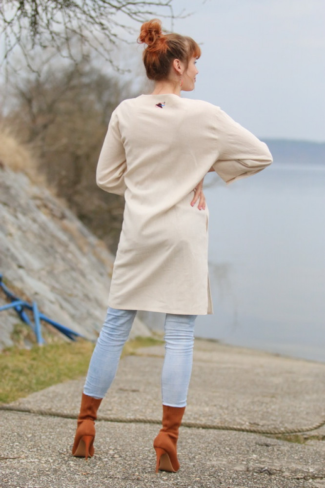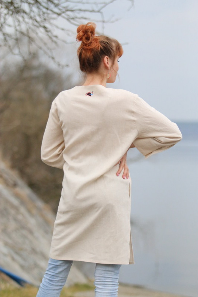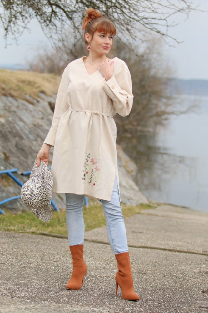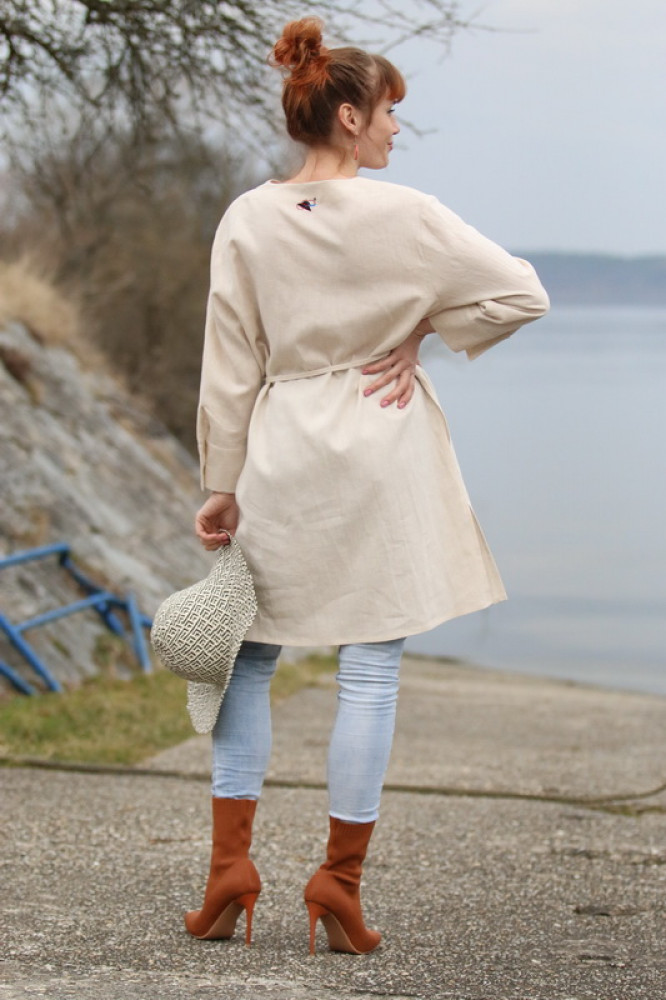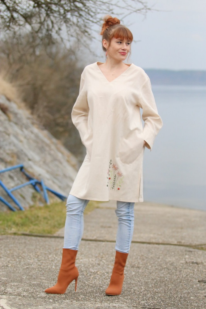 100% ľanová tunika s vreckami, vzdušnými rozparkami a rukávovou manžetkou s ozdobnou drevenou gombičkou. Je praktická a pohodlná, ľahko kombinovateľná. Dá sa nosiť ako oversize, alebo s opaskom, obidva spôsoby sú milé a ženské.