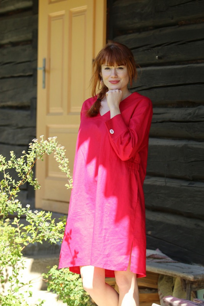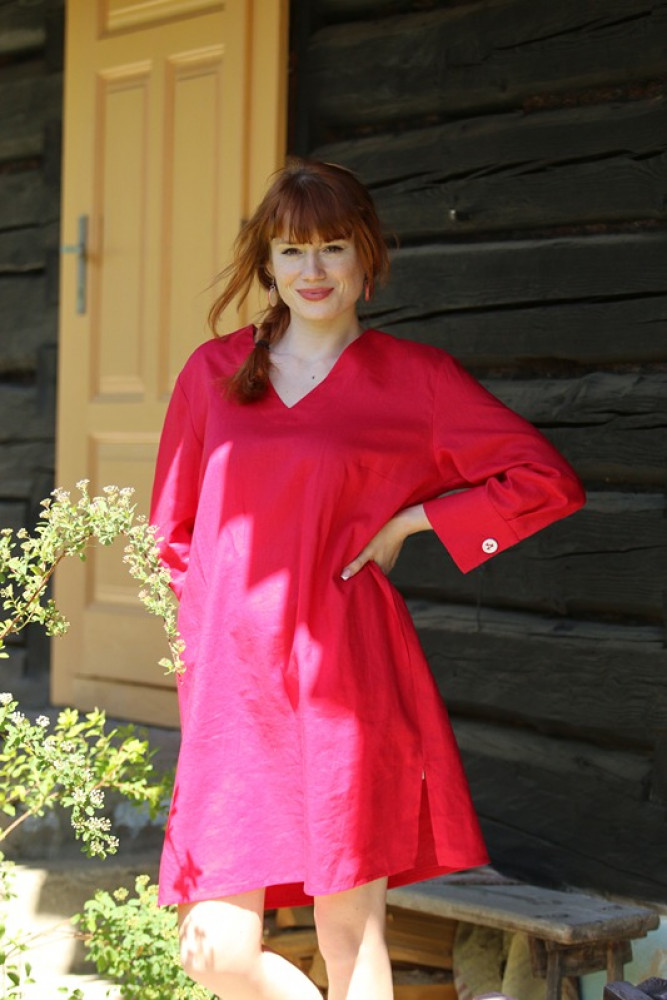 100% ľanová tunika s vreckami, vzdušnými rozparkami a rukávovou manžetkou s ozdobnou drevenou gombičkou. Je praktická a pohodlná, ľahko kombinovateľná. Dá sa nosiť ako oversize, alebo s opaskom, obidva spôsoby sú milé a ženské.