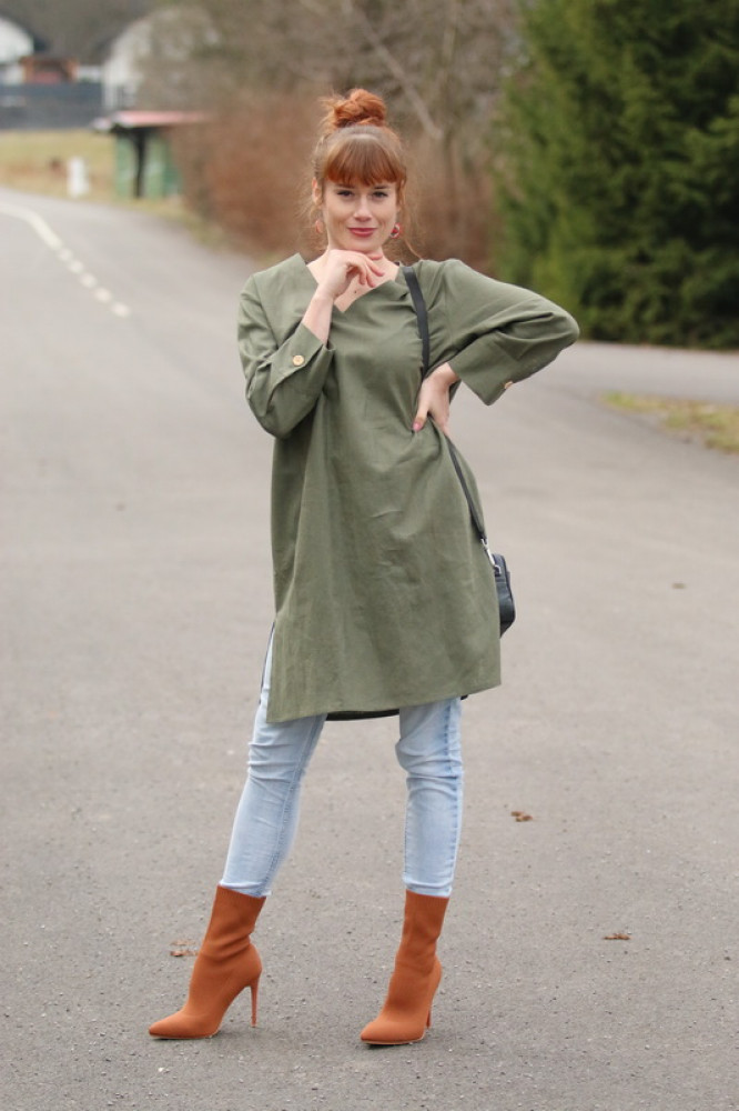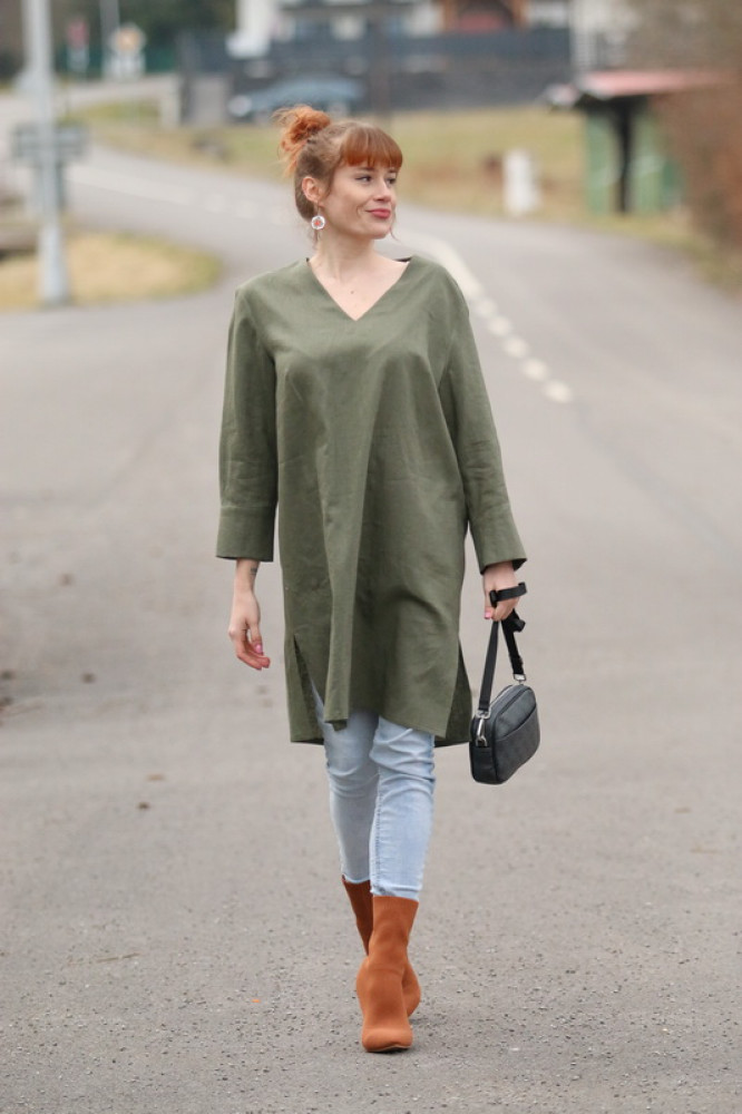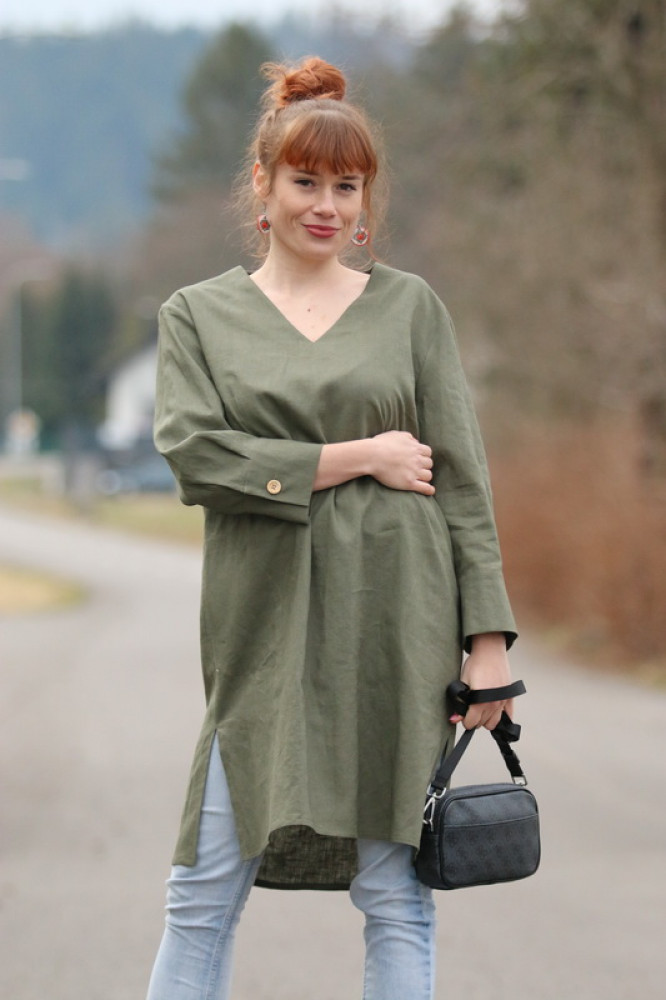 Véčkový výstrih opticky predlžuje krk a dodáva modelu jemnú eleganciu. Dlhé rukávy zakončené manžetou pôsobia upravene a robia z tuniky univerzálny kúsok vhodný na každodenné nosenie aj formálnejšie príležitosti. Minimalistický dizajn zvýrazňuje krásu prírodného materiálu a ľahko sa kombinuje s nohavicami, legínami aj sukňou.