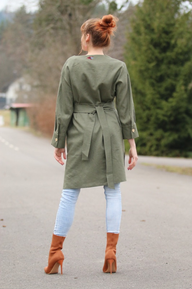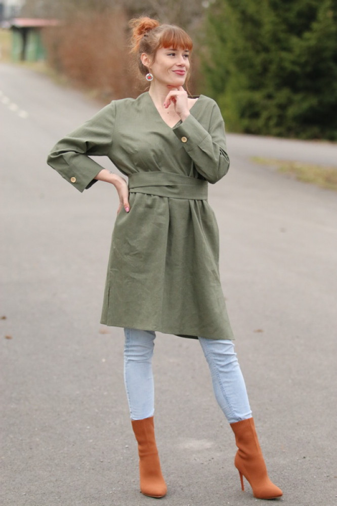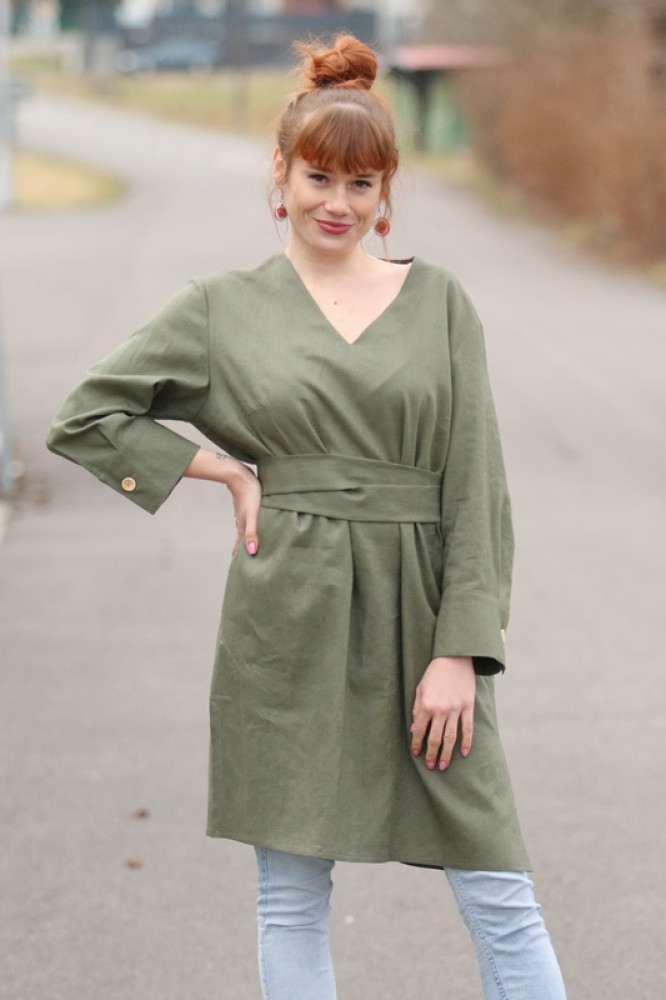 Ľanová tunika Krojové.sk zo 100 % ľanu s véčkovým výstrihom, dlhými rukávmi a možnosťou prepásania opaskom. Priedušný, pohodlný a nadčasový kúsok na každodenné nosenie.