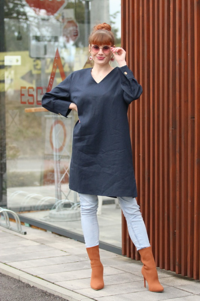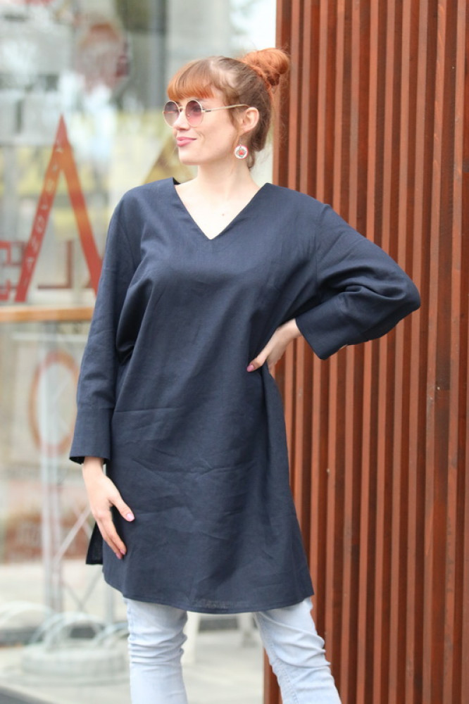 Véčkový výstrih opticky predlžuje krk a dodáva modelu jemnú eleganciu. Dlhé rukávy zakončené manžetou pôsobia upravene a robia z tuniky univerzálny kúsok vhodný na každodenné nosenie aj formálnejšie príležitosti. Minimalistický dizajn zvýrazňuje krásu prírodného materiálu a ľahko sa kombinuje s nohavicami, legínami aj sukňou.