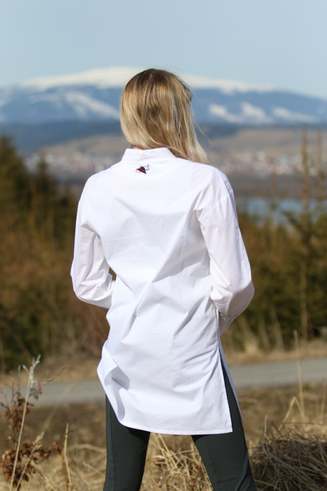 Má jemný véčkový výstrih so stojačikom, ktorý zdobí unikátna originálna výšivka Krojove.