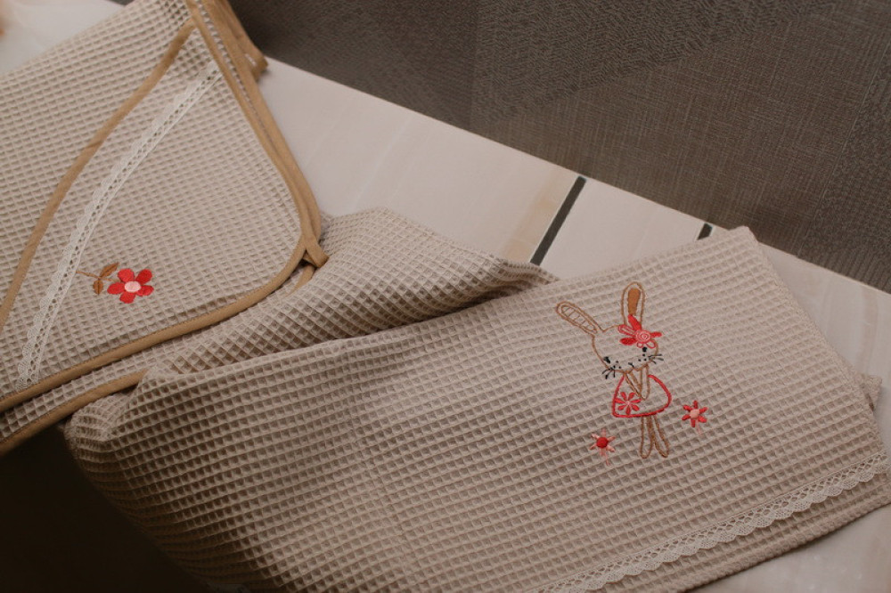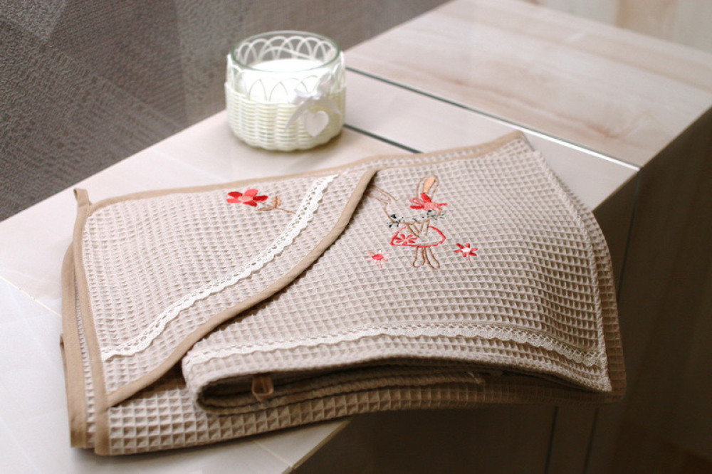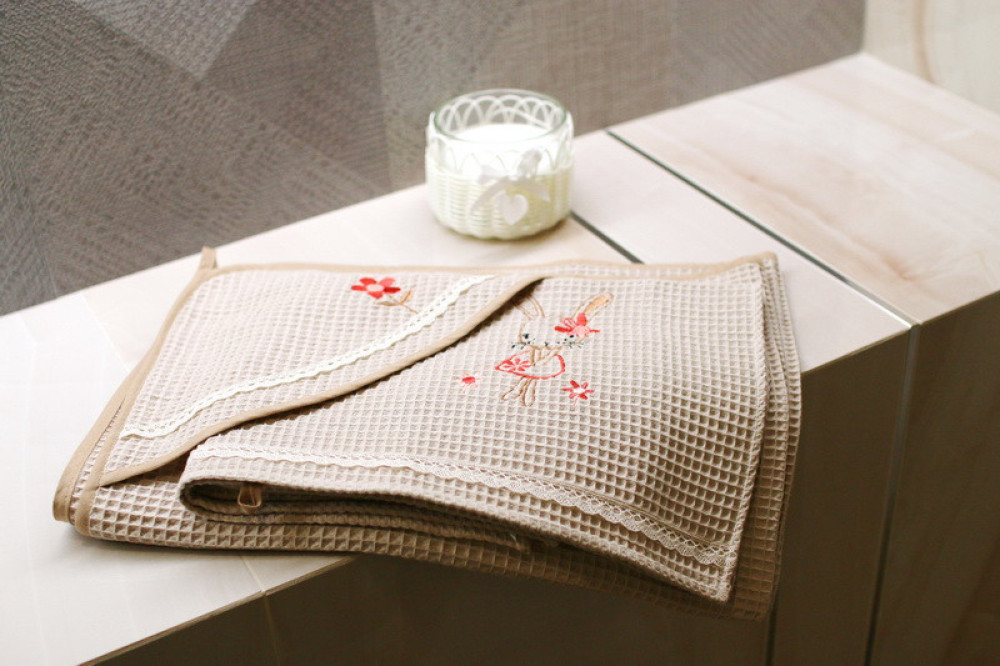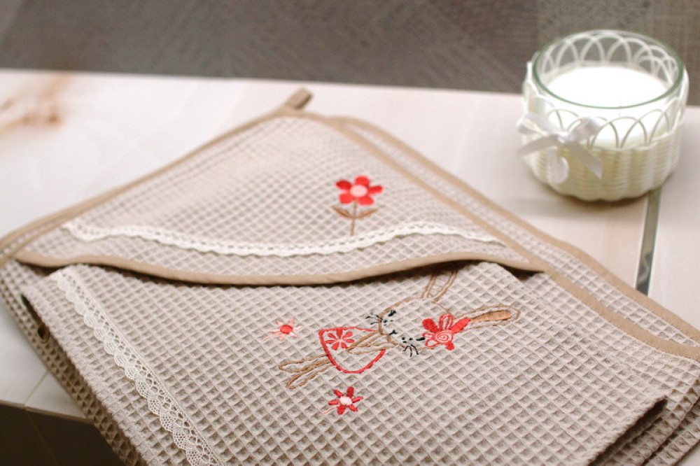Wafle bavlnený uterák s detským motívom veľmi dobre saje vlhkosť. Ozdobený jemnou čipkou s hravou detskou výšivkou poteší a zaujme každé dieťa. Je to správna voľba na obdarovanie vášho blízkeho do krstu či k sviatku. Uterák pôsobí na pohľad aj ako príjemný doplnok do vášho  domova. Na dotyk je veľmi jemný, šetrný k pokožke. Je možné ho kombinovať s detskými osuškami.