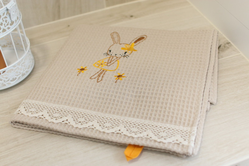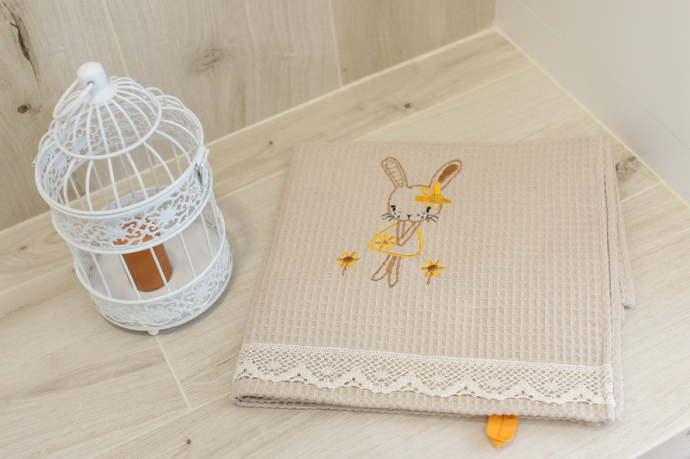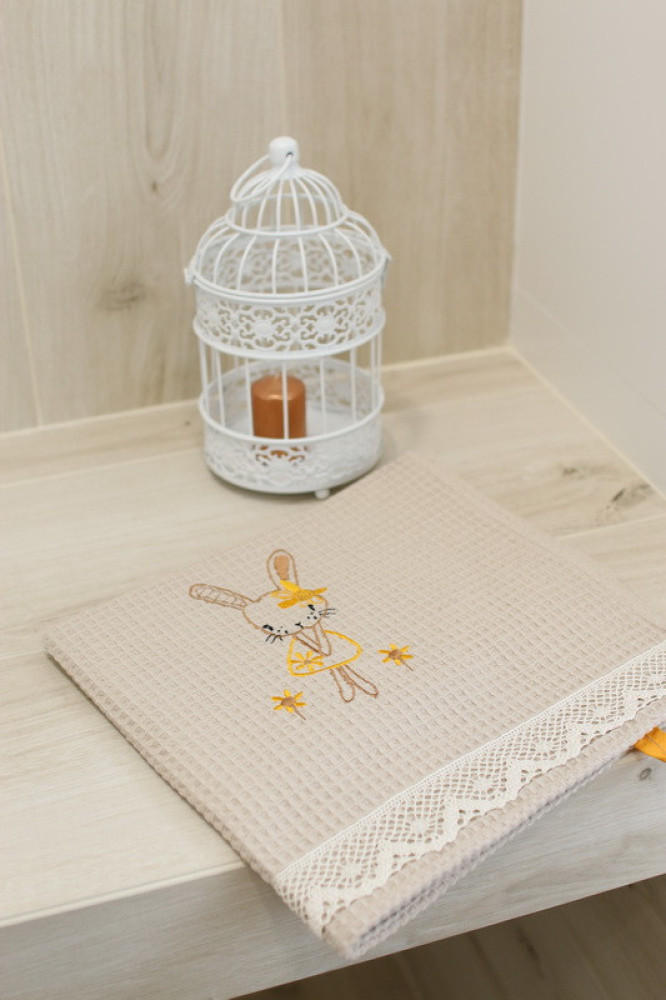 Wafle bavlnený uterák s detským motívom veľmi dobre saje vlhkosť. Ozdobený jemnou čipkou s hravou detskou výšivkou poteší a zaujme každé dieťa. Je to správna voľba na obdarovanie vášho blízkeho do krstu či k sviatku. Uterák pôsobí na pohľad aj ako príjemný doplnok do vášho  domova. Na dotyk je veľmi jemný, šetrný k pokožke. Je možné ho kombinovať s detskými osuškami.
