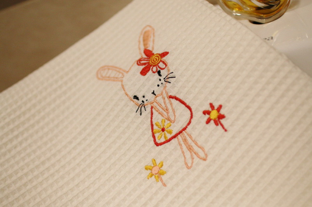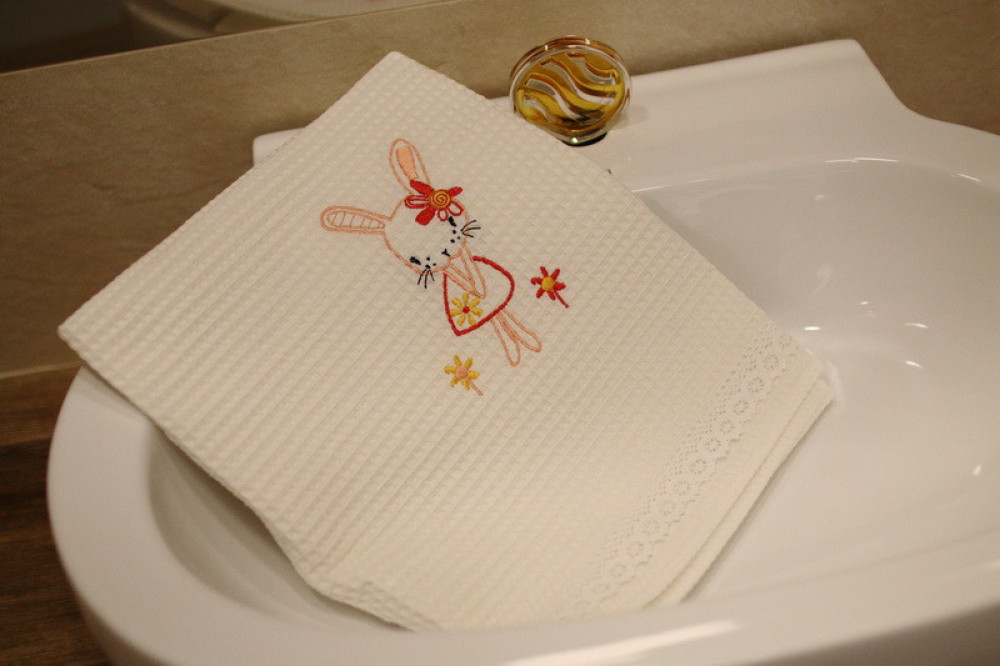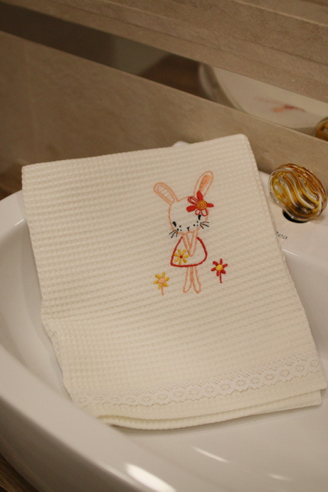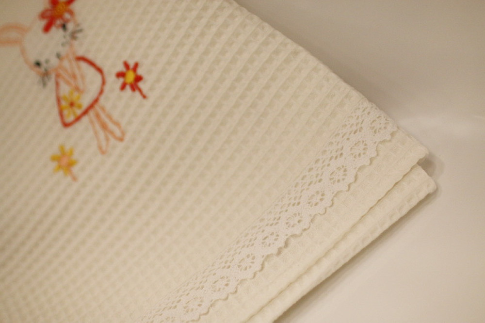 Wafle bavlnený uterák s detským motívom veľmi dobre saje vlhkosť. Ozdobený jemnou čipkou s hravou detskou výšivkou poteší a zaujme každé dieťa. Je to správna voľba na obdarovanie vášho blízkeho do krstu či k sviatku. Uterák pôsobí na pohľad aj ako príjemný doplnok do vášho domova. Na dotyk je veľmi jemný, šetrný k pokožke. Je možné ho kombinovať s detskými osuškami.