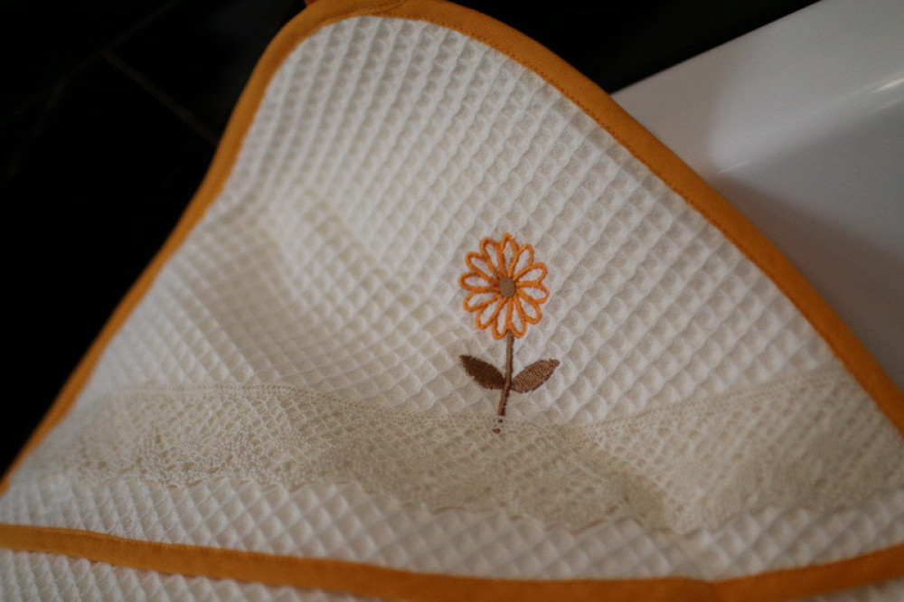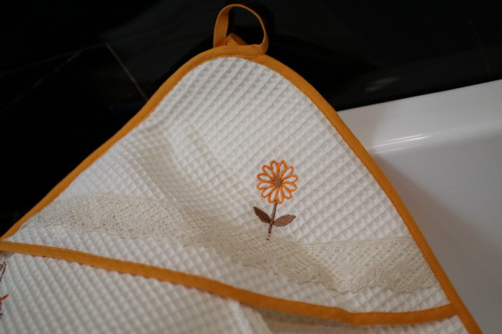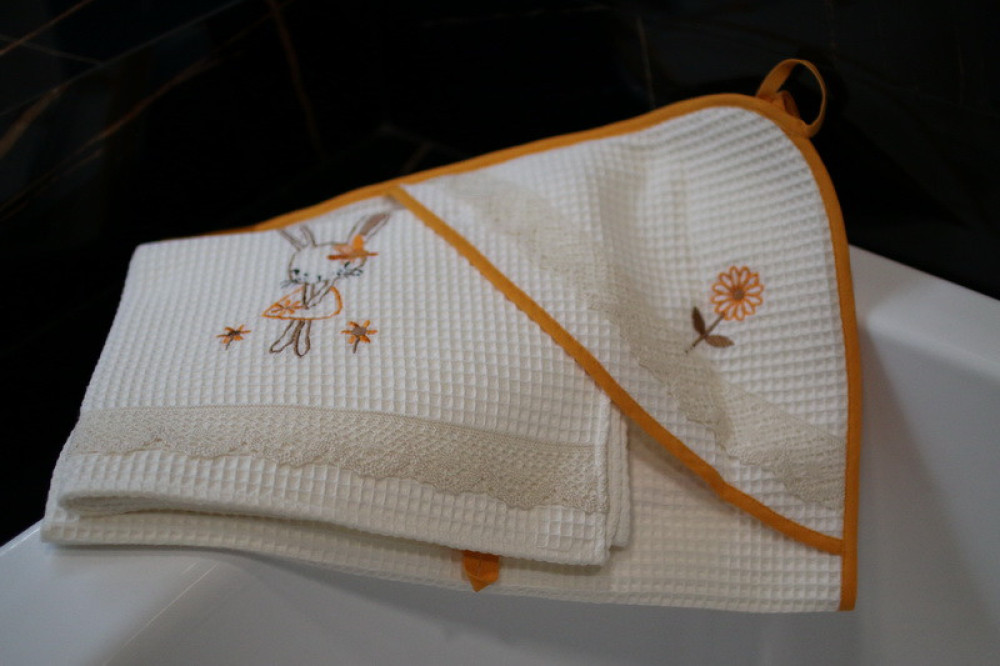 Wafle bavlnená osuška s detským motívom veľmi dobre saje vlhkosť. Ozdobená jemnou čipkou s hravou detskou výšivkou poteší a zaujme každé dieťa. Je to správna voľba na obdarovanie vášho blízkeho ku krstu či k sviatku. Osuška pôsobí na pohľad aj ako príjemný doplnok do vášho  domova. Na dotyk je veľmi jemná, šetrná k pokožke. Je možné ju kombinovať s detskými uterákmi.
