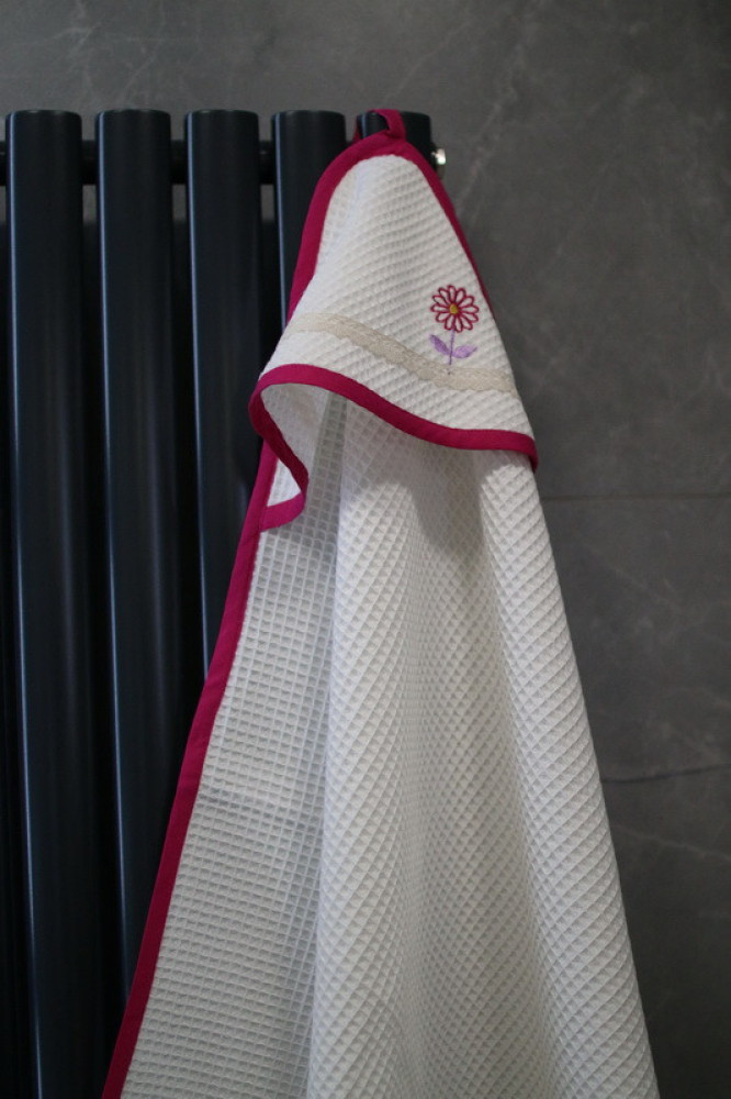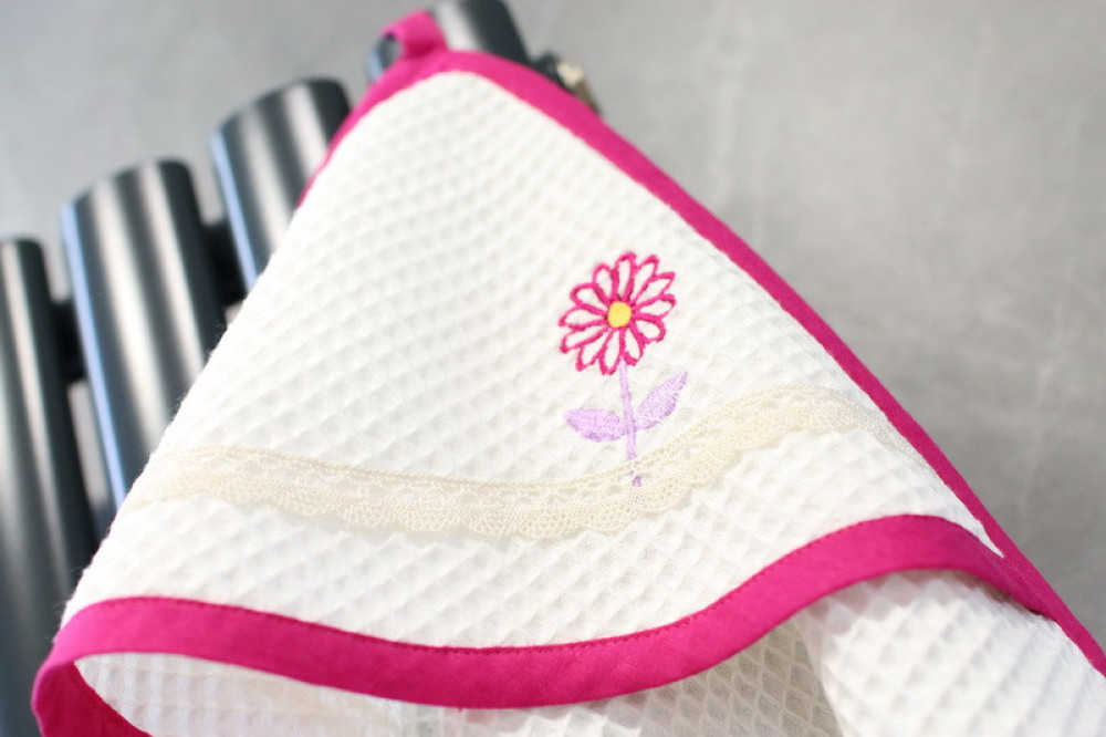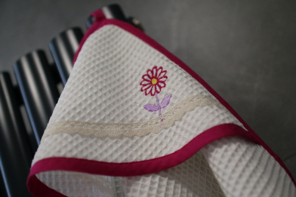Wafle bavlnená osuška s detským motívom veľmi dobre saje vlhkosť. Ozdobená jemnou čipkou s hravou detskou výšivkou poteší a zaujme každé dieťa. Je to správna voľba na obdarovanie vášho blízkeho ku krstu či k sviatku. Osuška pôsobí na pohľad aj ako príjemný doplnok do vášho domova. Na dotyk je veľmi jemná, šetrná k pokožke. Je možné ju kombinovať s detskými uterákmi.