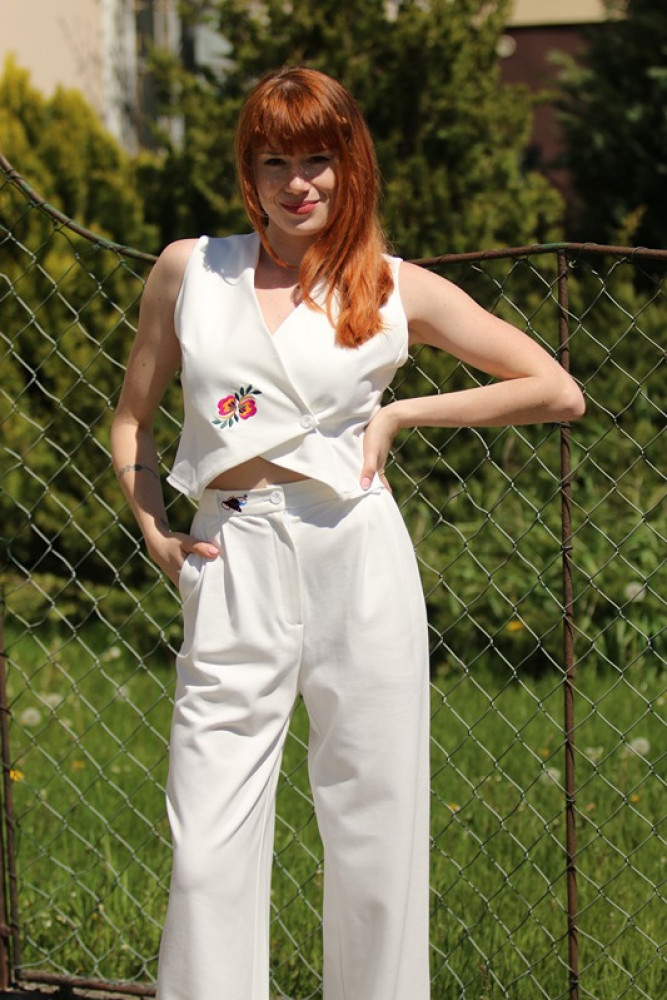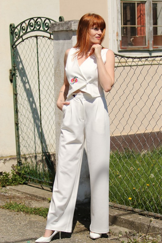 Elegantná vyšívaná krátka vestička s kokosovými gombíkmi, kombinovateľná s našimi nohavicami, kraťasmi či sukničkami. Pôsobí sviežo, mladistvo, elegantne a očarujúco. Jej výnimočný strih vám krásne opíše driek.