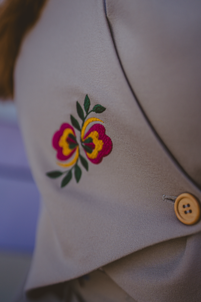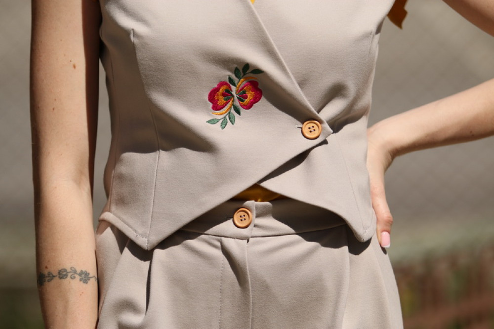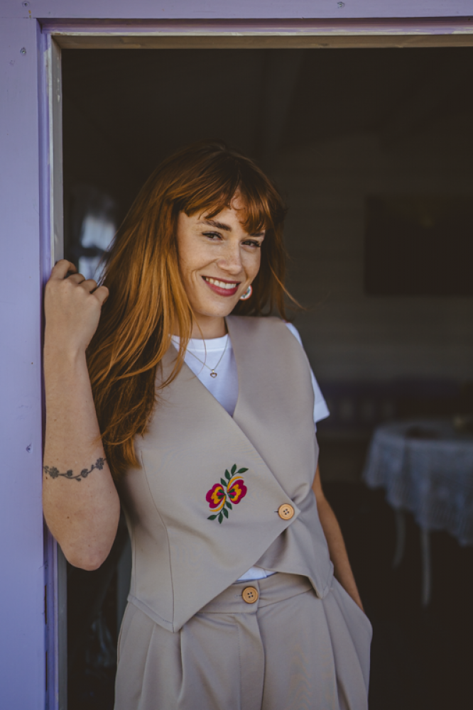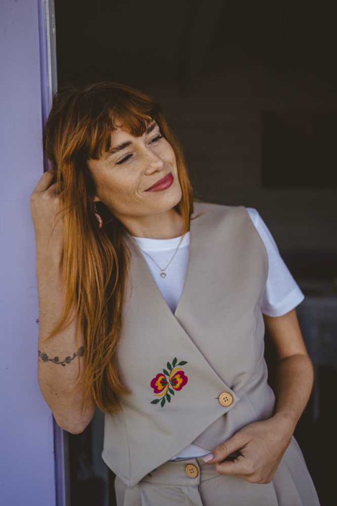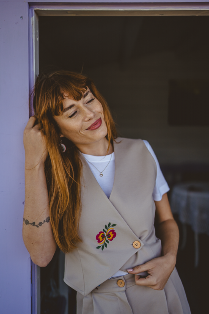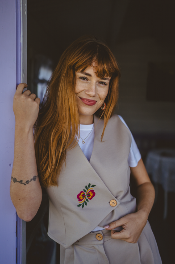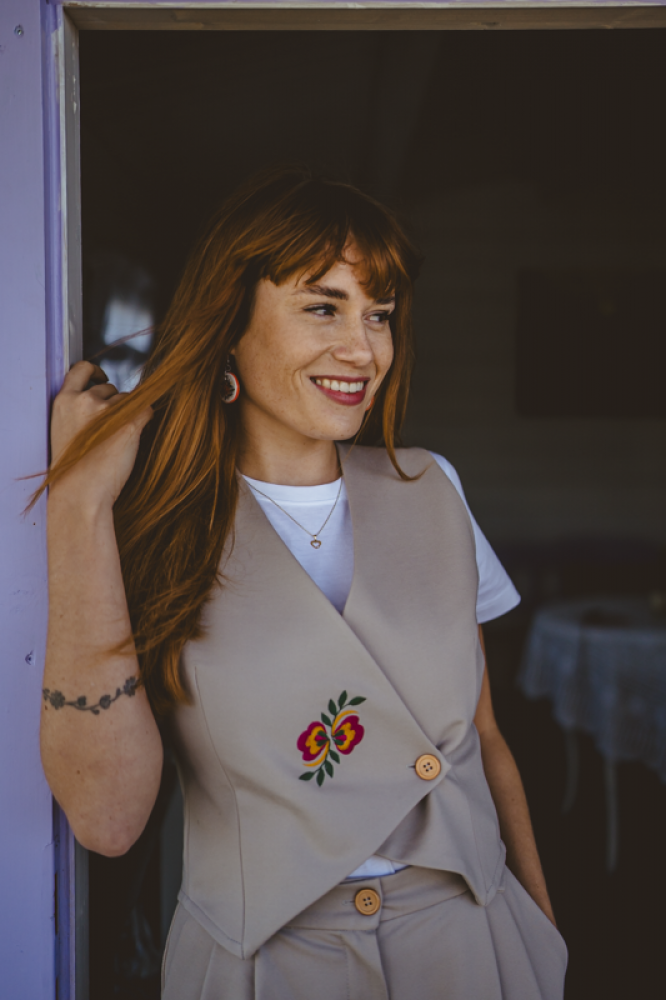 Elegantná vyšívaná krátka vestička s kokosovými gombíkmi, kombinovateľná s našimi nohavicami, kraťasmi či sukničkami. Pôsobí sviežo, mladistvo, elegantne a očarujúco. Jej výnimočný strih vám krásne opíše driek.