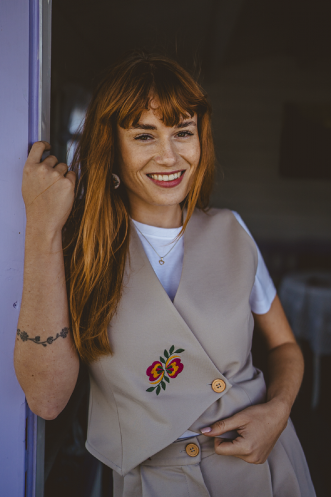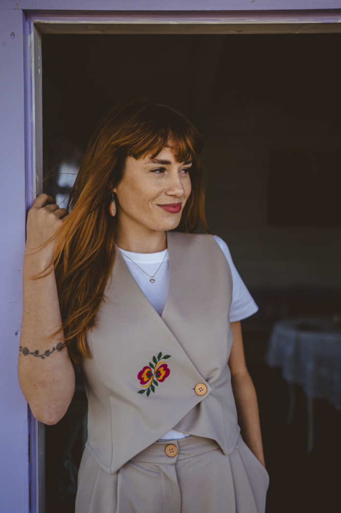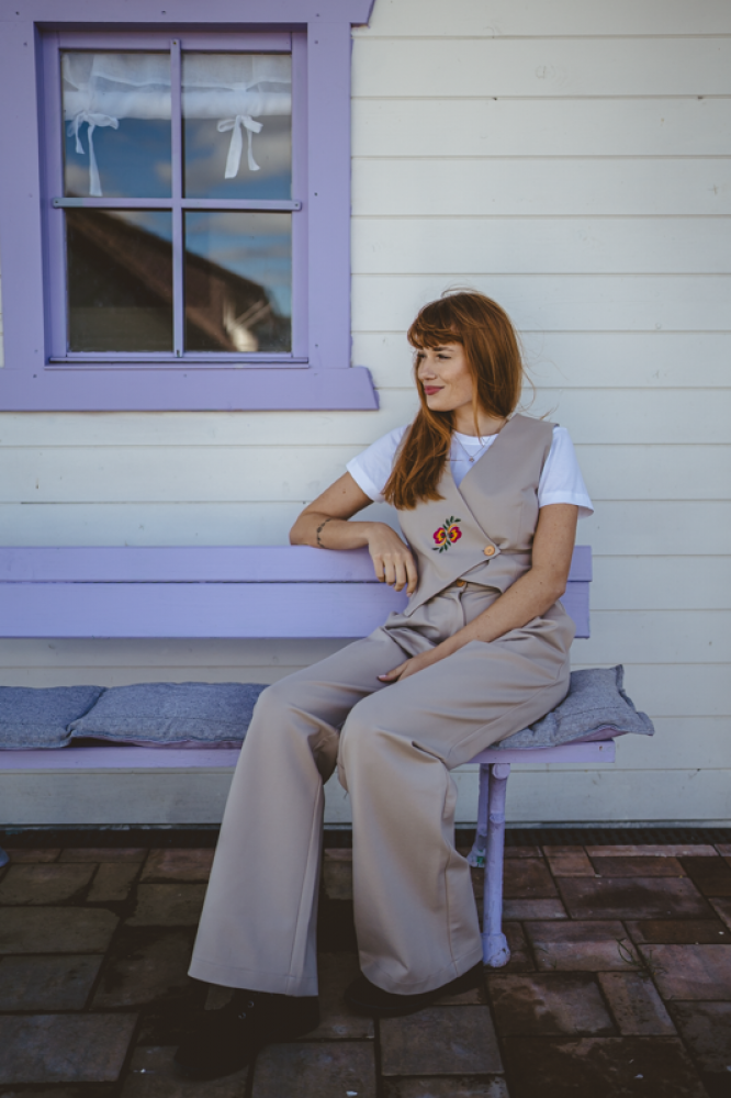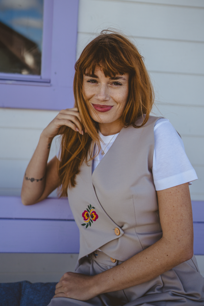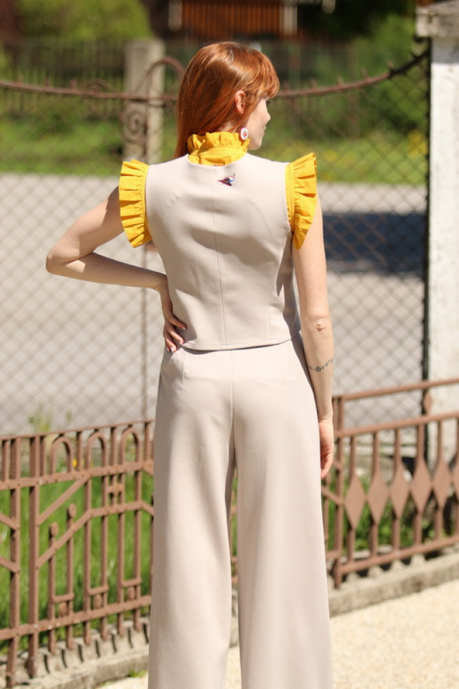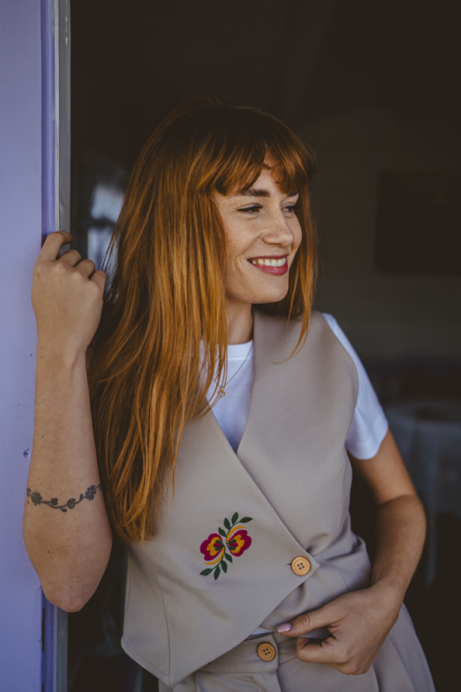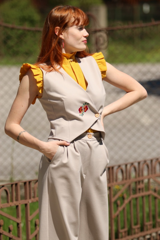 Elegantná vyšívaná krátka vestička s kokosovými gombíkmi, kombinovateľná s našimi nohavicami, kraťasmi či sukničkami. Pôsobí sviežo, mladistvo, elegantne a očarujúco. Jej výnimočný strih vám krásne opíše driek.