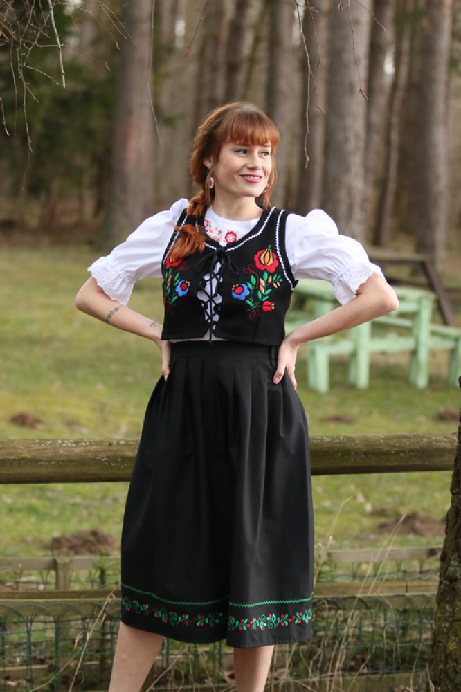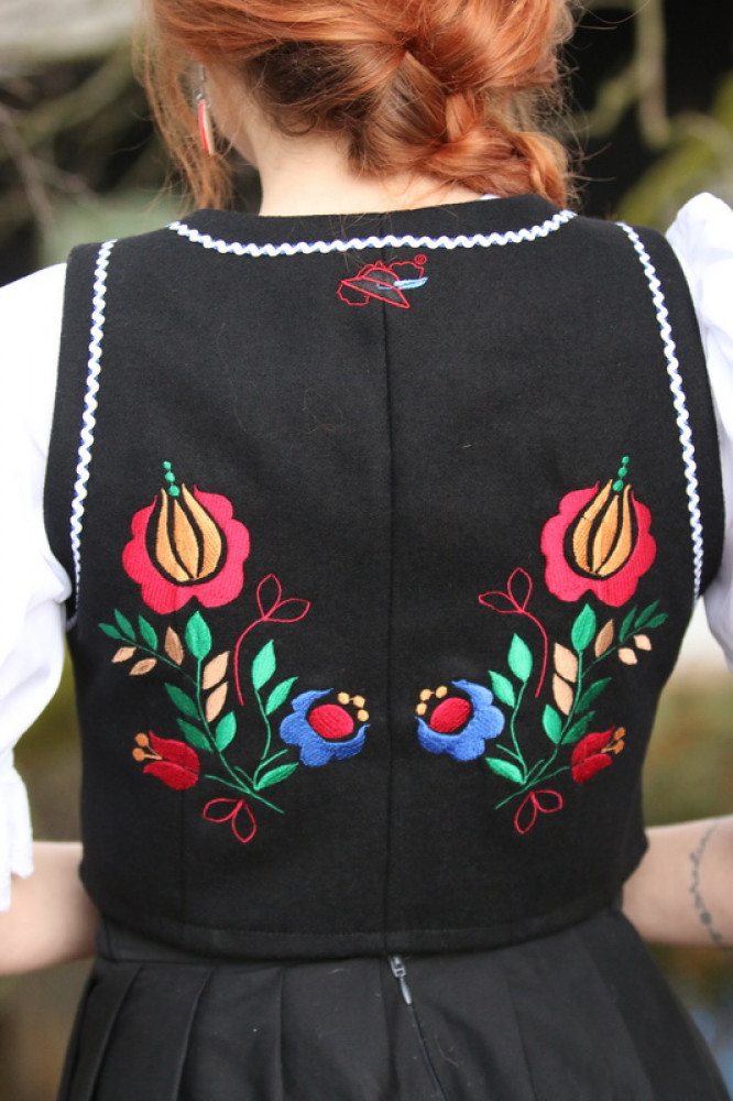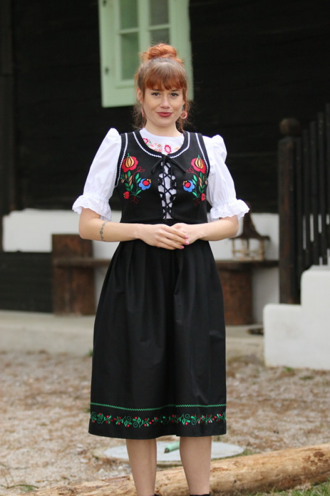 Dámsky vyšívaný folklórny lajblik z čierneho súkna na ozdobné viazanie pomocou šnúrky, ktorý sa oblieka na blúzku či košeľu.