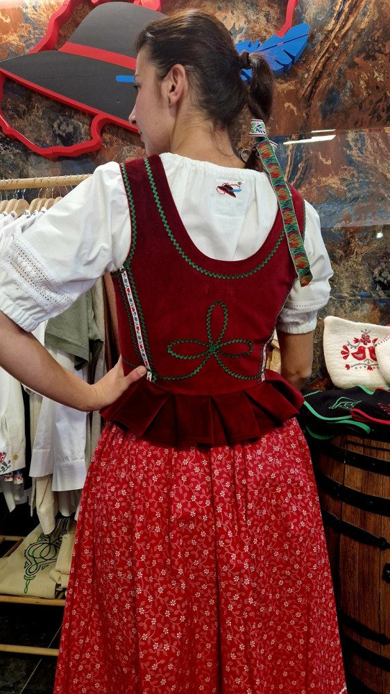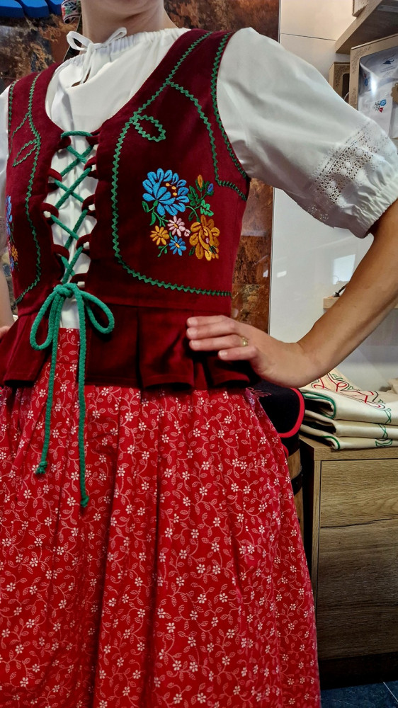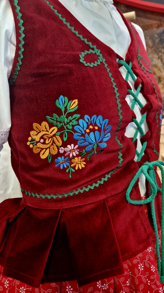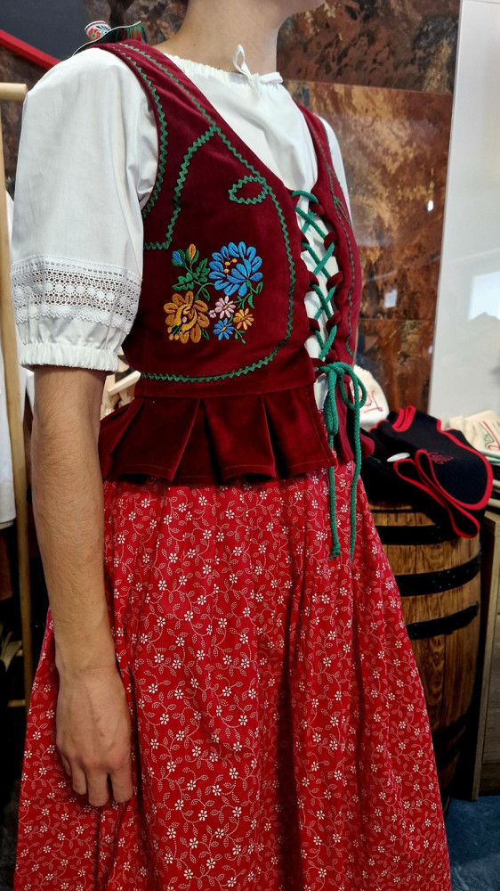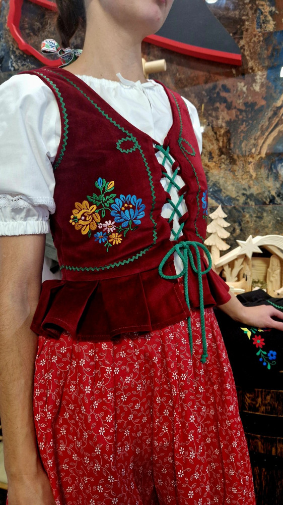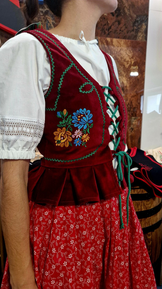 Elegantný dámsky zamatový vyšívaný lajblík zančky Krojove.sk v bordovej farbe je originálny kúsok inšpirovaný slovenskou tradíciou. Jemný zamat dopĺňa precízna farebná výšivka a zelené šnurovanie, ktoré zvýrazňuje pás a krásne formuje postavu.