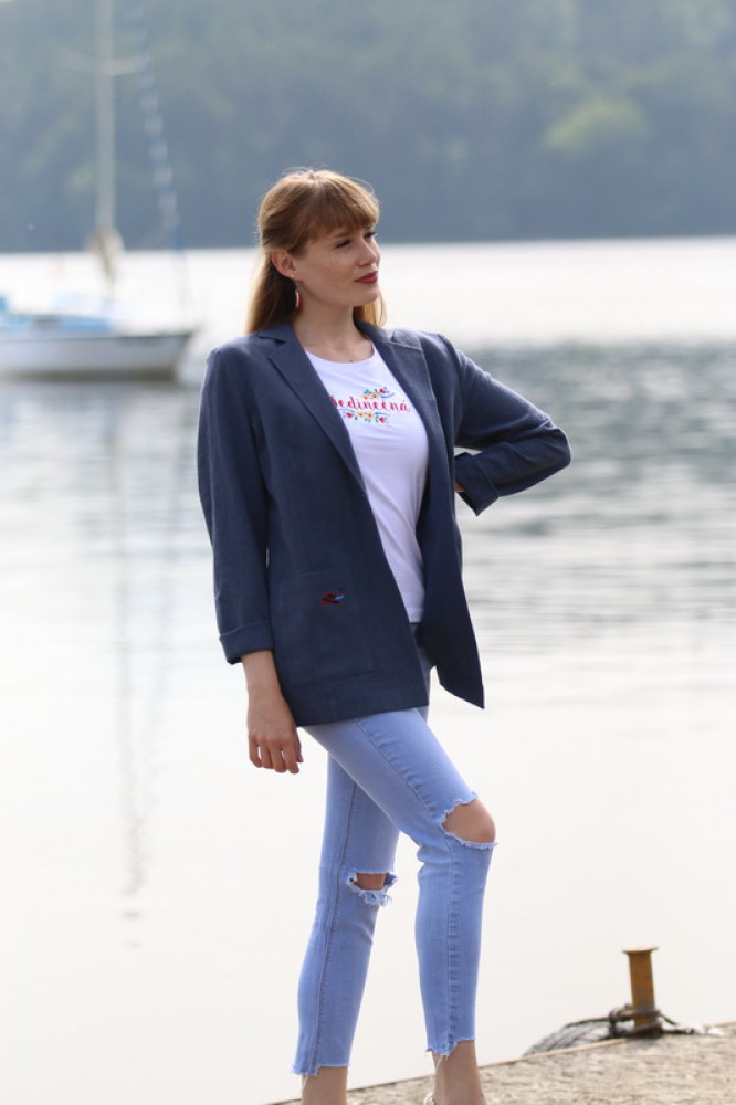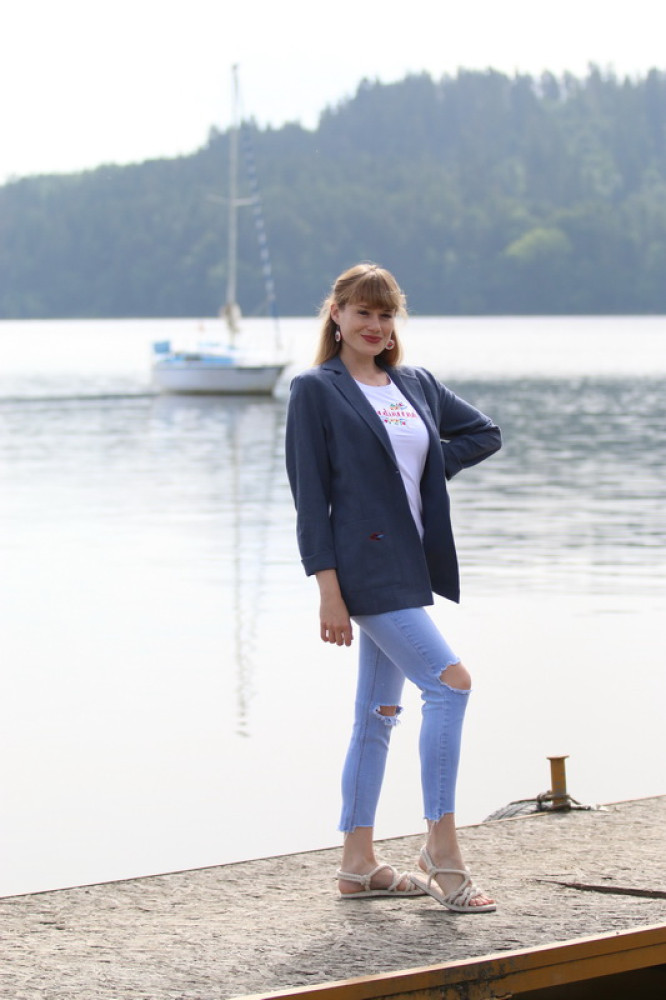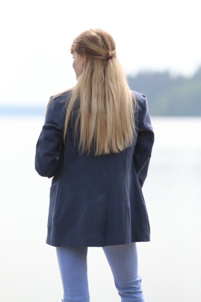 Veľmi prepracované jemne priliehavé sačko z predpraného ľanu na jeden gombík s rázporkom na zadnom diele. Rukávy sú dlhé, dajú sa vyhrnúť. Sačko je vďaka svojmu strihu a farbe veľmi kombinovateľné, dá sa nosiť elegantne alebo športovo.