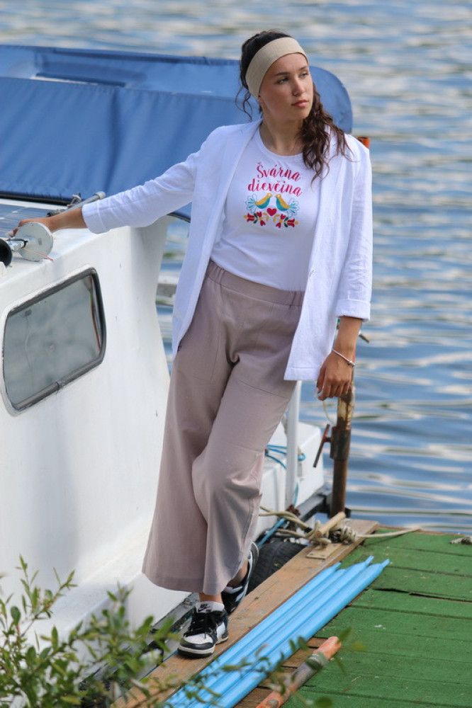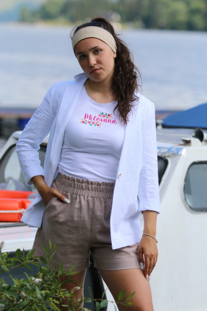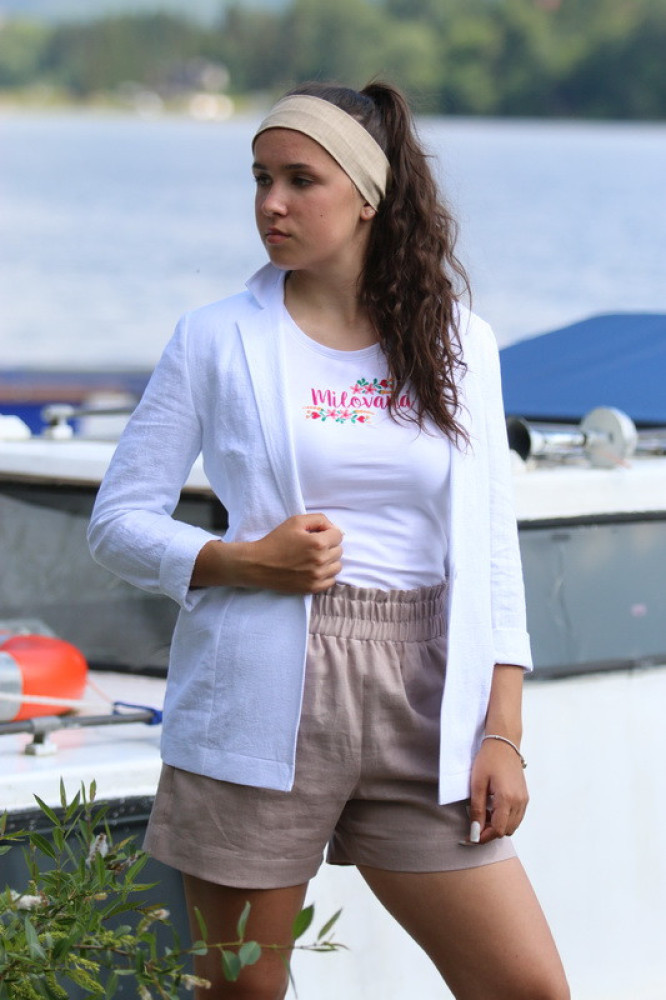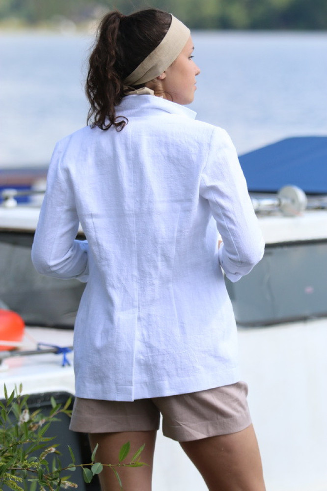 Veľmi prepracované jemne priliehavé sačko z bieleho predpraného ľanu na jeden gombík s rázporkom na zadnom diele. Rukávy sú dlhé, dajú sa vyhrnúť. Sačko je vďaka svojmu strihu a farbe veľmi kombinovateľné, dá sa nosiť elegantne alebo športovo.