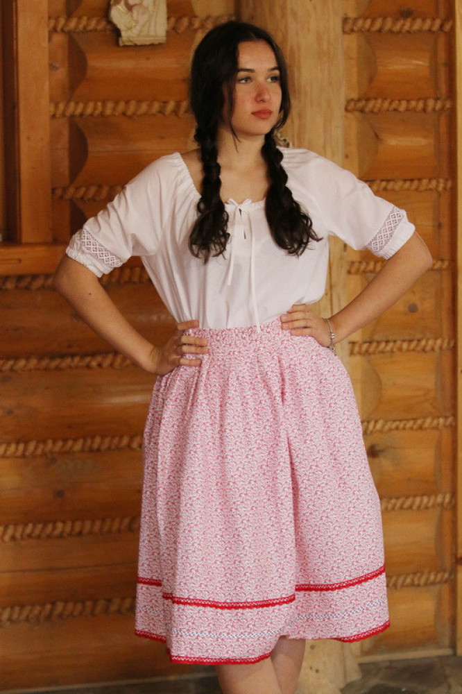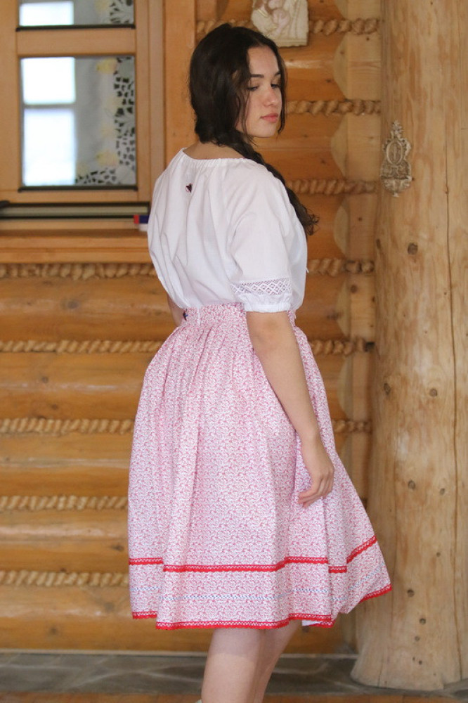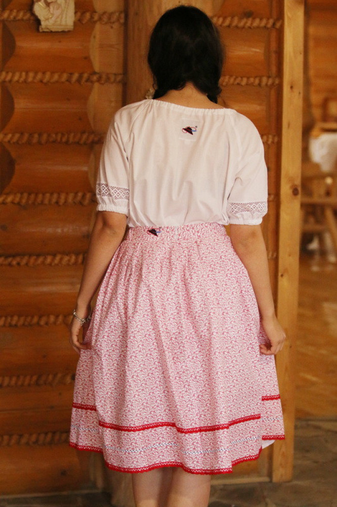 Bavlnená ľudová sukňa lemovaná háčkovanou krajkou so zapínaním vzadu na zips. Je pohodlná, voľná, priedušná, príjemná na dotyk. Je možné ju kombinovať s našimi blúzkami.