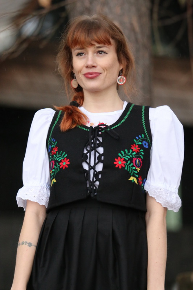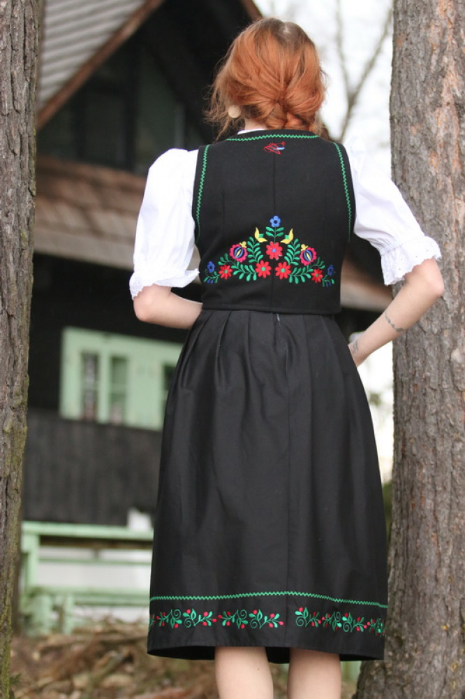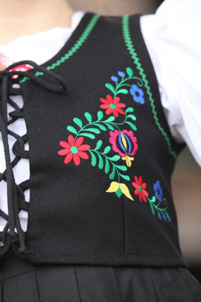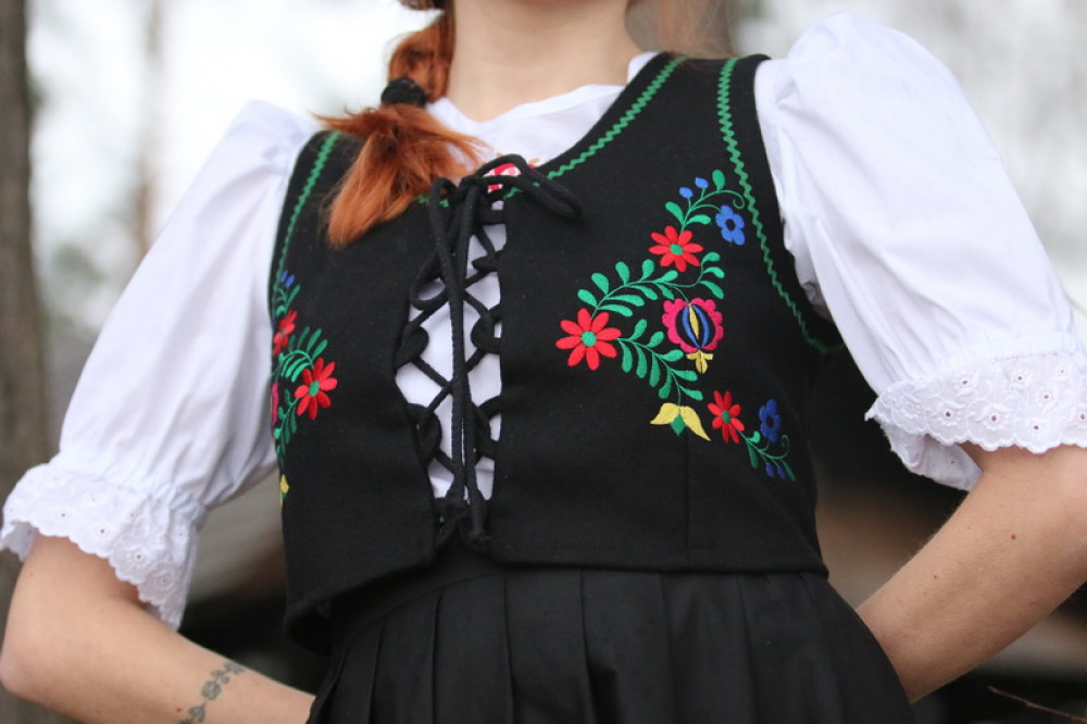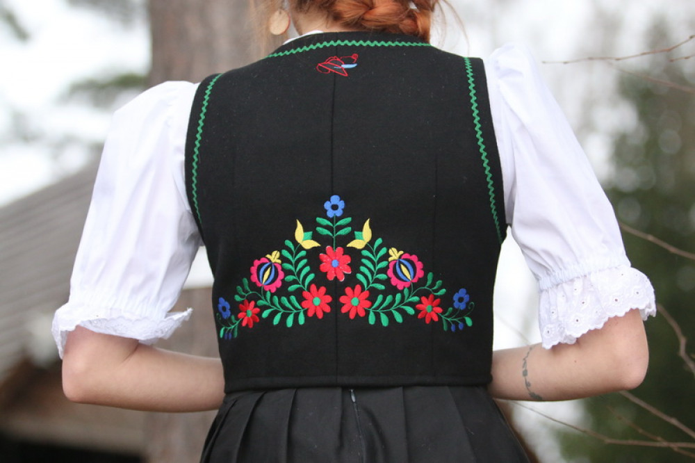 Dámsky vyšívaný folklórny lajblik z čierneho súkna na ozdobné viazanie pomocou šnúrky, ktorý sa oblieka na blúzku či košeľu.
